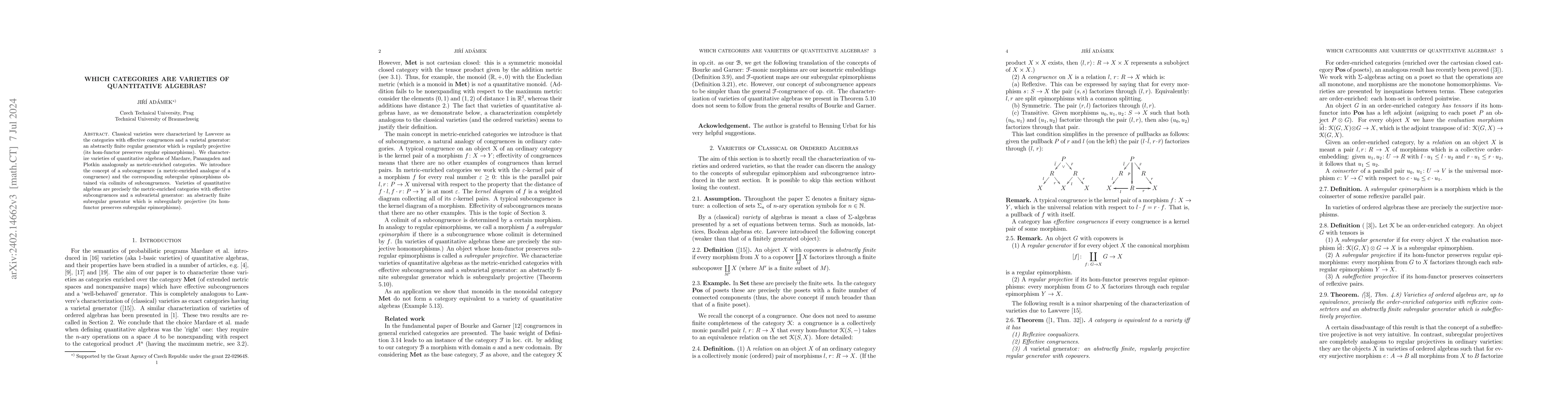 This paper characterizes varieties of quantitative algebras as metric-enriched categories with effective subcongruences and a subvarietal generator, introducing the concept of subcongruences and subregular epimorphisms. It parallels the classical characterization of classical varieties by Lawvere.