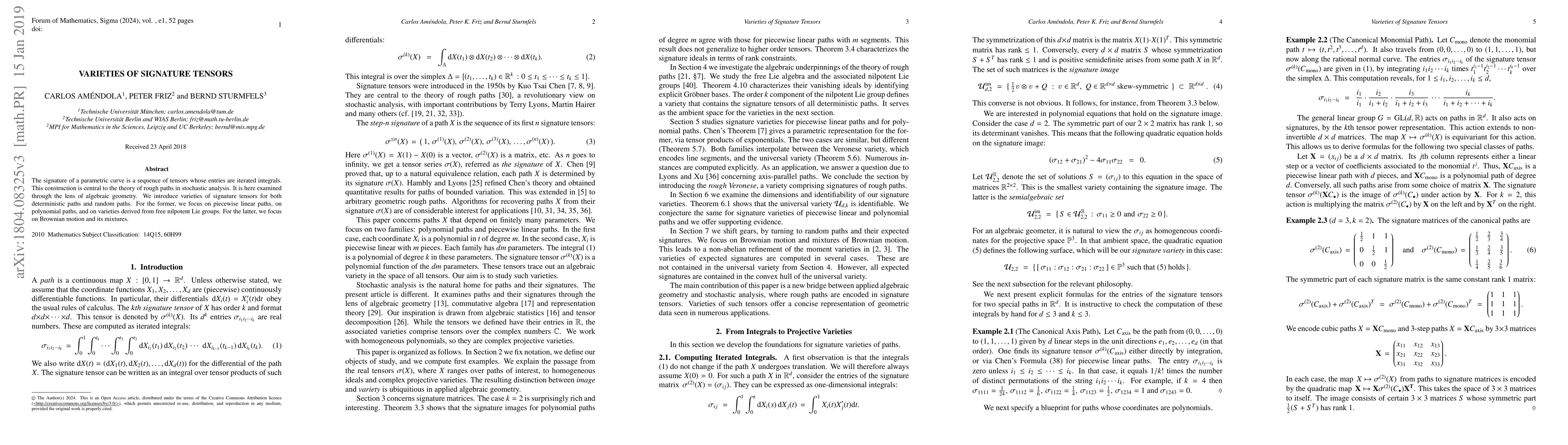 This paper explores the algebraic geometry of signature tensors, which are integral sequences used in rough path theory. It introduces varieties of signature tensors for deterministic paths, including piecewise linear and polynomial paths, and for random paths, particularly Brownian motion and its mixtures.