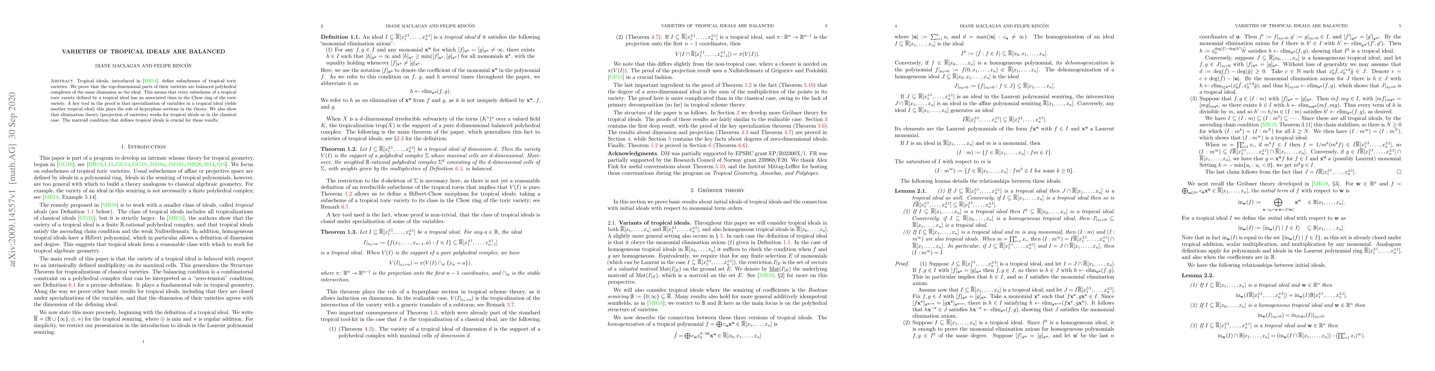 This paper proves that the top-dimensional parts of varieties defined by tropical ideals are balanced polyhedral complexes. The key insight is that variable specialization in tropical ideals produces another tropical ideal, analogous to hyperplane sections, and elimination theory functions similarly for tropical ideals as in classical cases.