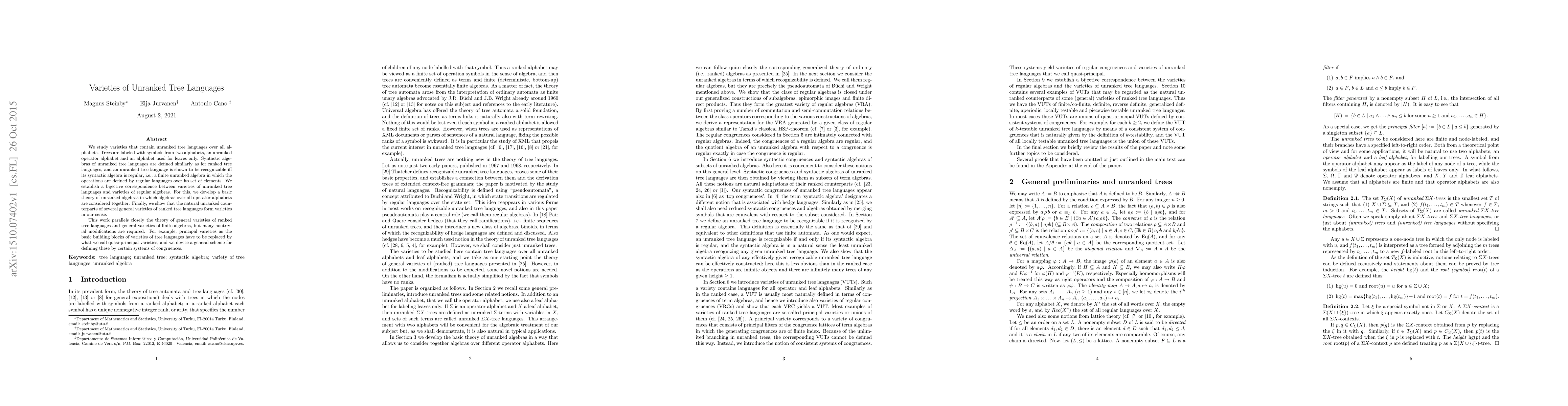 This paper explores varieties containing unranked tree languages, defining syntactic algebras and establishing their recognizability through regular algebras. It introduces quasi-principal varieties as the foundational elements, replacing principal varieties, and demonstrates a correspondence between varieties of unranked tree languages and regular algebras.