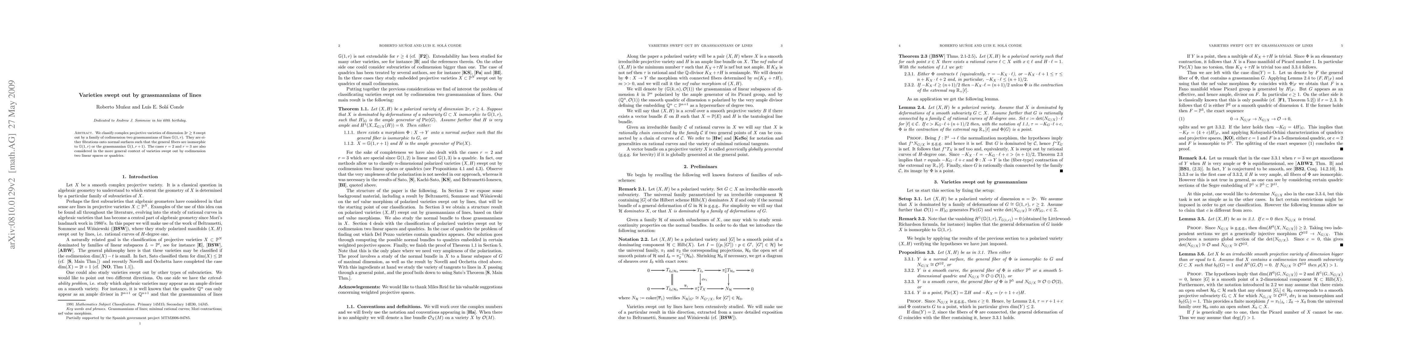 This paper classifies complex projective varieties swept out by grassmannians of lines, finding they are either fibrations onto normal surfaces or isomorphic to specific Grassmannian varieties.