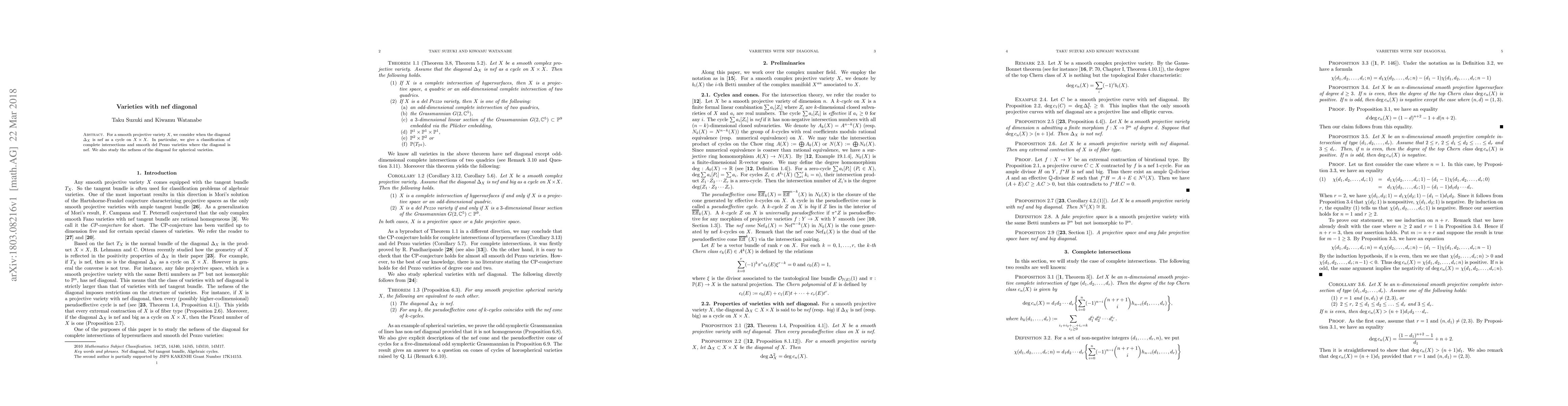 This paper classifies smooth projective varieties, specifically complete intersections and smooth del Pezzo varieties, where the diagonal $\Delta_X$ is nef as a cycle on $X\times X$. It also investigates the nefness of the diagonal in the context of spherical varieties.