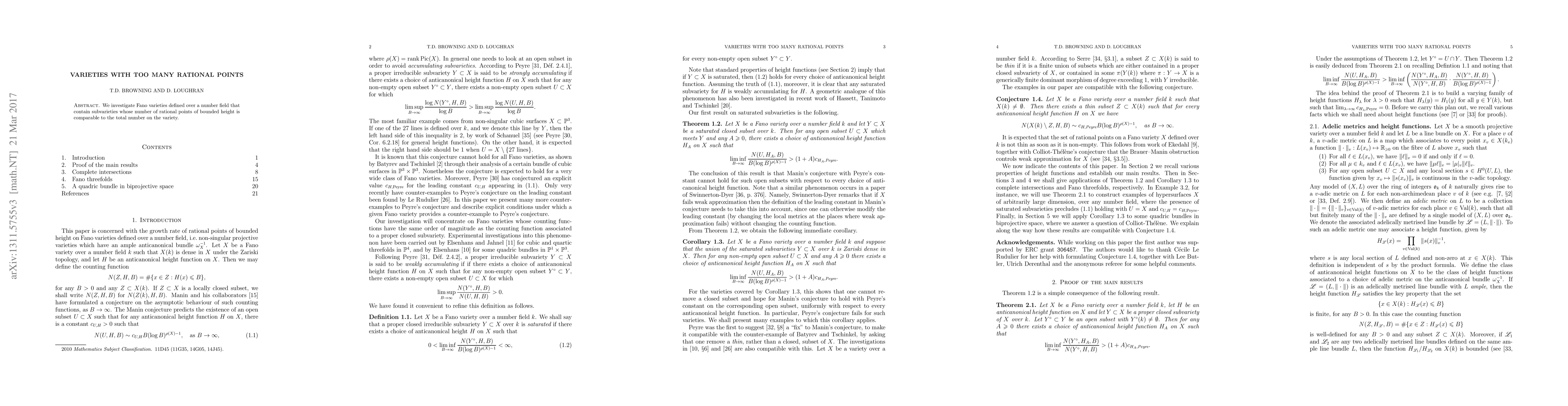 We investigate Fano varieties defined over a number field that contain subvarieties whose number of rational points of bounded height is comparable to the total number on the variety.