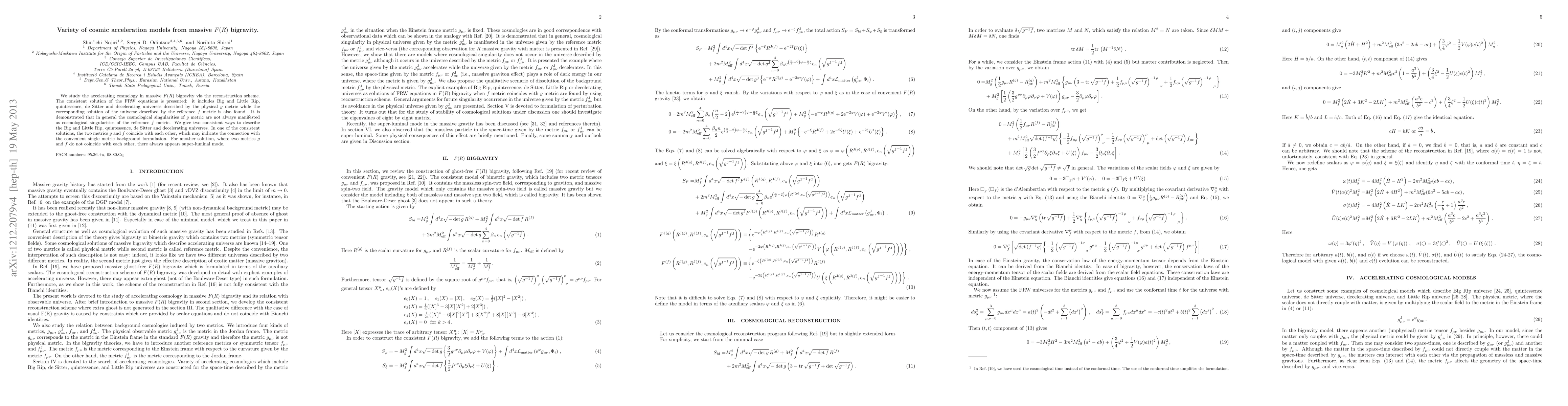 We study the accelerating cosmology in massive $F(R)$ bigravity via the reconstruction scheme. The consistent solution of the FRW equations is presented: it includes Big and Little Rip, quintessence, de Sitter and decelerating universes described by the physical $g$ metric while the corresponding solution of the universe described by the reference $f$ metric is also found. It is demonstrated that in general the cosmological singularities of $g$ metric are not always manifested as cosmological singularities of the reference $f$ metric. We give two consistent ways to describe the Big and Little Rip, quintessence, de Sitter and decelerating universes. In one of the consistent solutions, the two metrics $g$ and $f$ coincide with each other, which may indicate the connection with the convenient single metric background formulation. For another solution, where two metrics $g$ and $f$ do not coincide with each other, here always appears super-luminal mode.
