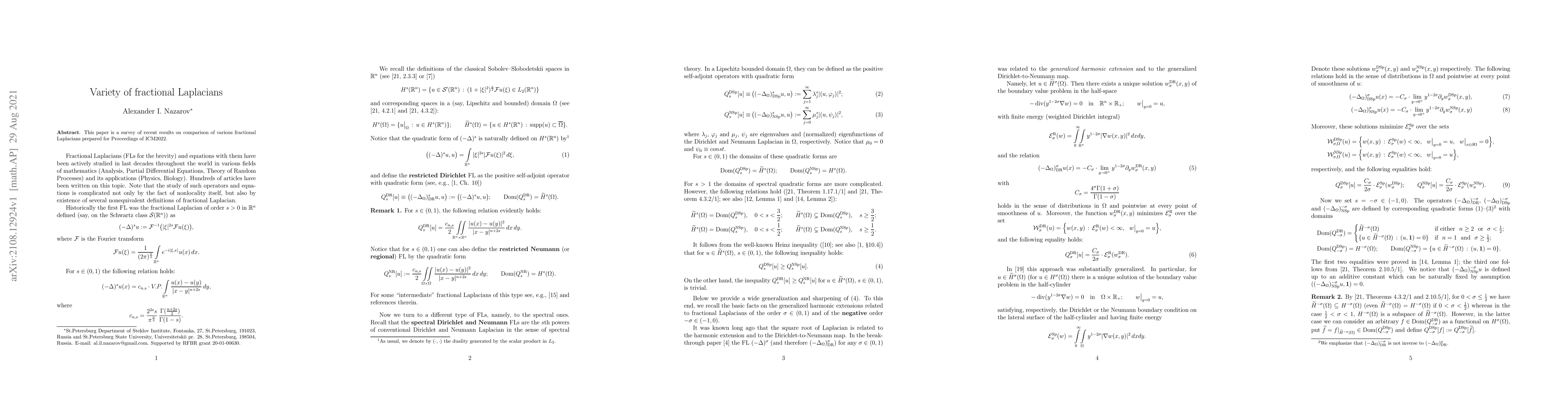 This paper surveys recent advancements in comparing different forms of fractional Laplacians, providing insights into their properties and applications. It was prepared for the Proceedings of ICM2022.
