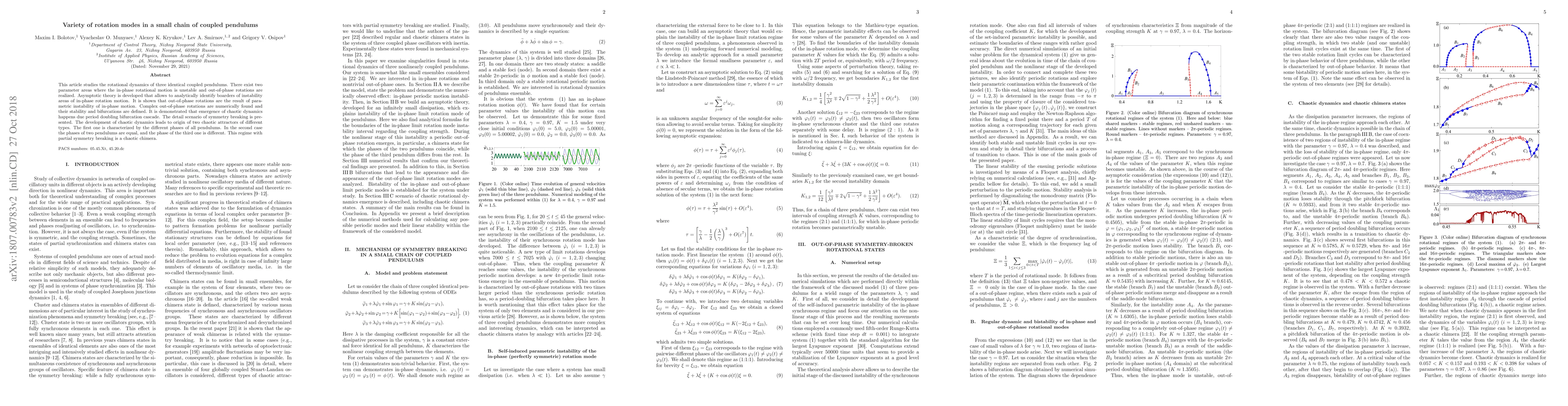 This article studies the rotational dynamics of three identical coupled pendulums. There exist two parameter areas where the in-phase rotational motion is unstable and out-of-phase rotations are realized. Asymptotic theory is developed that allows to analytically identify boarders of instability areas of in-phase rotation motion. It is shown that out-of-phase rotations are the result of parametric instability of in-phase motion. Complex out-of-phase rotations are numerically found and their stability and bifurcations are defined. It is demonstrated that emergence of chaotic dynamics happens due period doubling bifurcation cascade. The detail scenario of symmetry breaking is presented. The development of chaotic dynamics leads to origin of two chaotic attractors of different types. The first one is characterized by the different phases of all pendulums. In the second case the phases of two pendulums are equal, and the phase of the third one is different. This regime with partial symmetry breaking is a chaotic chimera.
