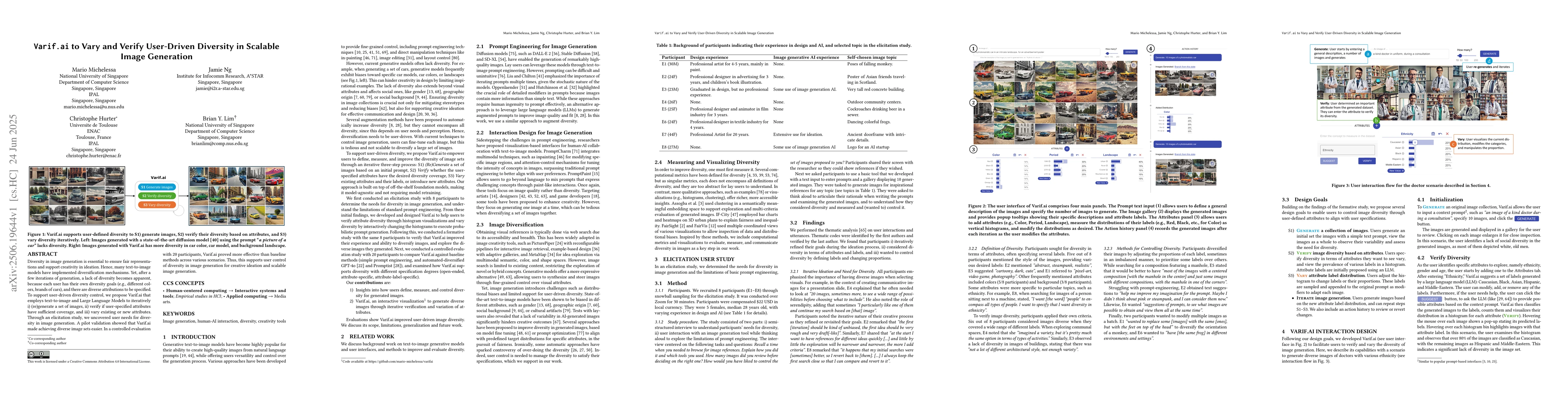 Diversity in image generation is essential to ensure fair representations and support creativity in ideation. Hence, many text-to-image models have implemented diversification mechanisms. Yet, after a few iterations of generation, a lack of diversity becomes apparent, because each user has their own diversity goals (e.g., different colors, brands of cars), and there are diverse attributions to be specified. To support user-driven diversity control, we propose Varif.ai that employs text-to-image and Large Language Models to iteratively i) (re)generate a set of images, ii) verify if user-specified attributes have sufficient coverage, and iii) vary existing or new attributes. Through an elicitation study, we uncovered user needs for diversity in image generation. A pilot validation showed that Varif.ai made achieving diverse image sets easier. In a controlled evaluation with 20 participants, Varif.ai proved more effective than baseline methods across various scenarios. Thus, this supports user control of diversity in image generation for creative ideation and scalable image generation.