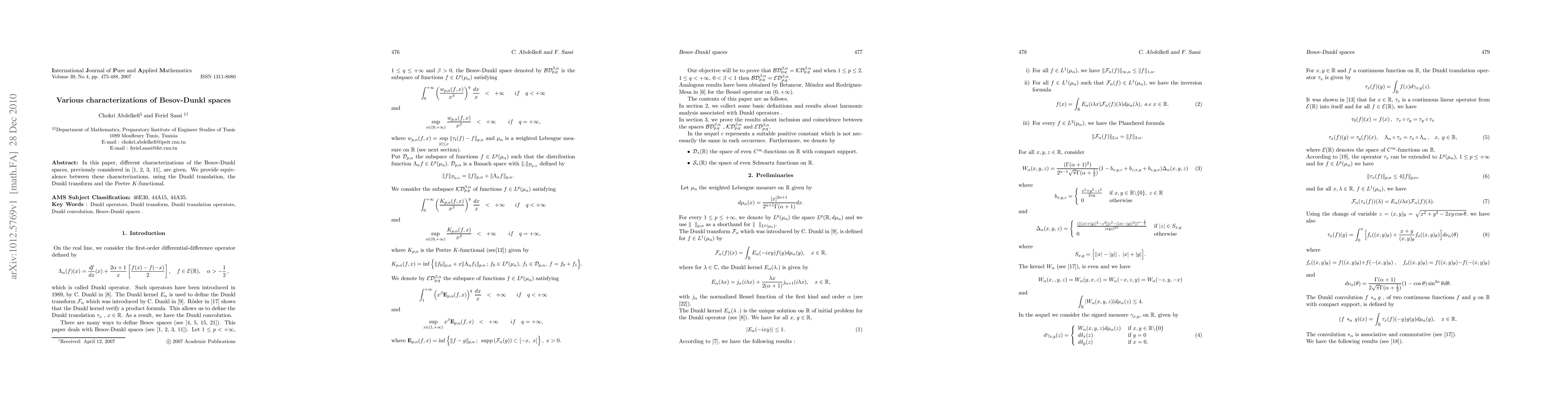 This paper explores various characterizations of Besov-Dunkl spaces, establishing equivalences among them through the Dunkl translation, Dunkl transform, and Peetre K-functional. The focus is on the interplay between these mathematical tools in defining Besov-Dunkl spaces.