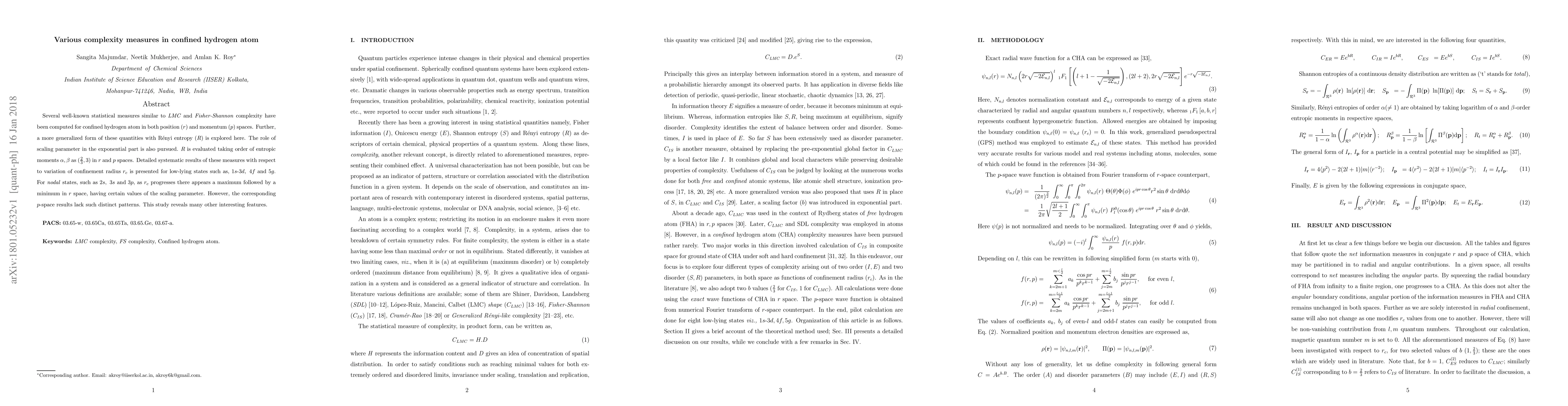This paper computes various complexity measures like LMC and Fisher-Shannon complexity for confined hydrogen atom states in both position and momentum spaces, exploring generalized forms with Rényi entropy. It reveals distinct patterns in position space for nodal states as confinement radius varies, while momentum space results lack such clear trends.