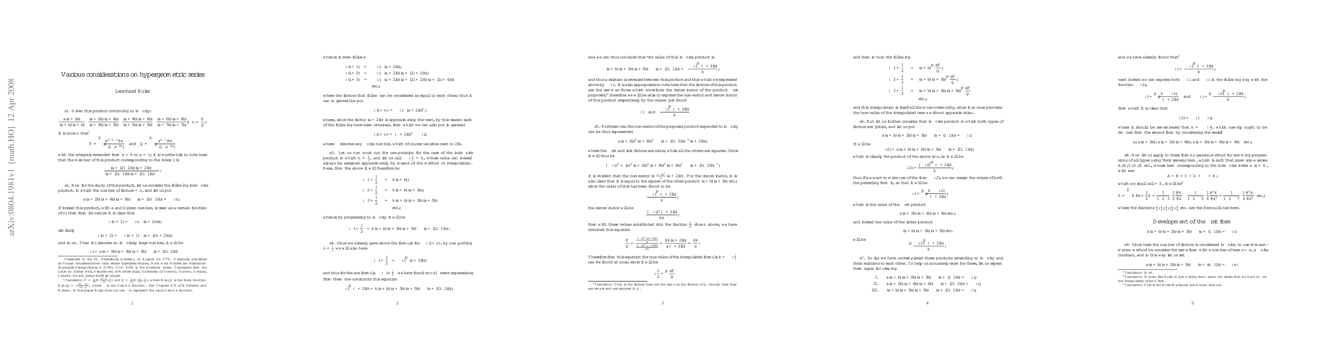 E661 in the Enestrom index. This was originally published as "Variae considerationes circa series hypergeometricas" (1776). In this paper Euler is looking at the asymptotic behavior of infinite products that are similar to the Gamma function. He looks at the relations between some infinite products and integrals. He takes the logarithm of these infinite products, and expands these using the Euler-Maclaurin summation formula. In section 14, Euler seems to be rederiving some of the results he already proved in the paper. However I do not see how these derivations are different. If any readers think they understand please I would appreciate it if you could email me. I am presently examining Euler's work on analytic number theory. The two main topics I want to understand are the analytic continuation of analytic functions and the connection to divergent series, and the asymptotic behavior of the Gamma function.
