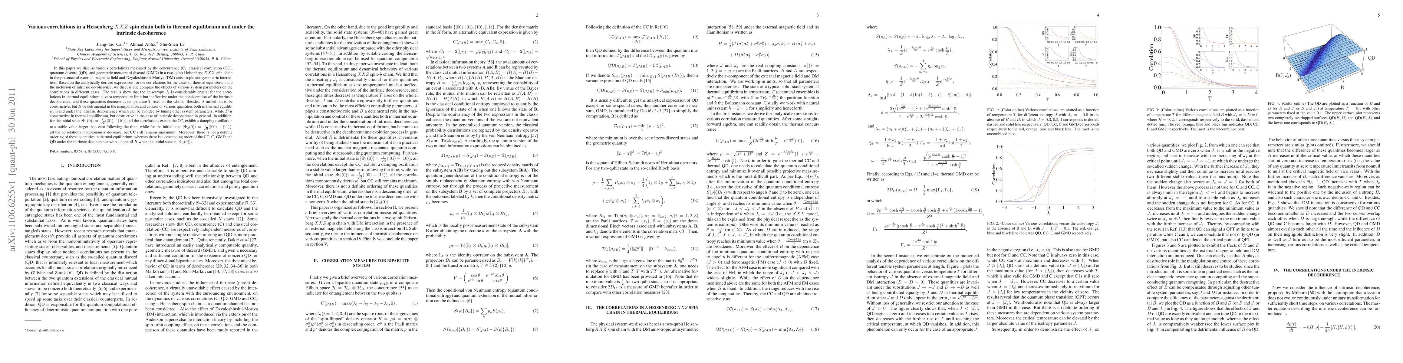 In this paper we discuss various correlations measured by the concurrence (C), classical correlation (CC), quantum discord (QD), and geometric measure of discord (GMD) in a two-qubit Heisenberg XXZ spin chain in the presence of external magnetic field and Dzyaloshinskii-Moriya (DM) anisotropic antisymmetric interaction. Based on the analytically derived expressions for the correlations for the cases of thermal equilibrium and the inclusion of intrinsic decoherence, we discuss and compare the effects of various system parameters on the correlations in different cases. The results show that the anisotropy Jz is considerably crucial for the correlations in thermal equilibrium at zero temperature limit but ineffective under the consideration of the intrinsic decoherence, and these quantities decrease as temperature T rises on the whole. Besides, J turned out to be constructive, but B be detrimental in the manipulation and control of various quantities both in thermal equilibrium and under the intrinsic decoherence which can be avoided by tuning other system parameters, while D is constructive in thermal equilibrium, but destructive in the case of intrinsic decoherence in general. In addition, for the initial state $|\Psi_1(0) > = \frac{1}{\sqrt{2}} (|01 > + |10 >)$, all the correlations except the CC, exhibit a damping oscillation to a stable value larger than zero following the time, while for the initial state $|\Psi_2(0) > = \frac{1}{\sqrt{2}} (|00 > + |11 >)$, all the correlations monotonously decrease, but CC still remains maximum. Moreover, there is not a definite ordering of these quantities in thermal equilibrium, whereas there is a descending order of the CC, C, GMD and QD under the intrinsic decoherence with a nonnull B when the initial state is $|\Psi_2(0) >$.