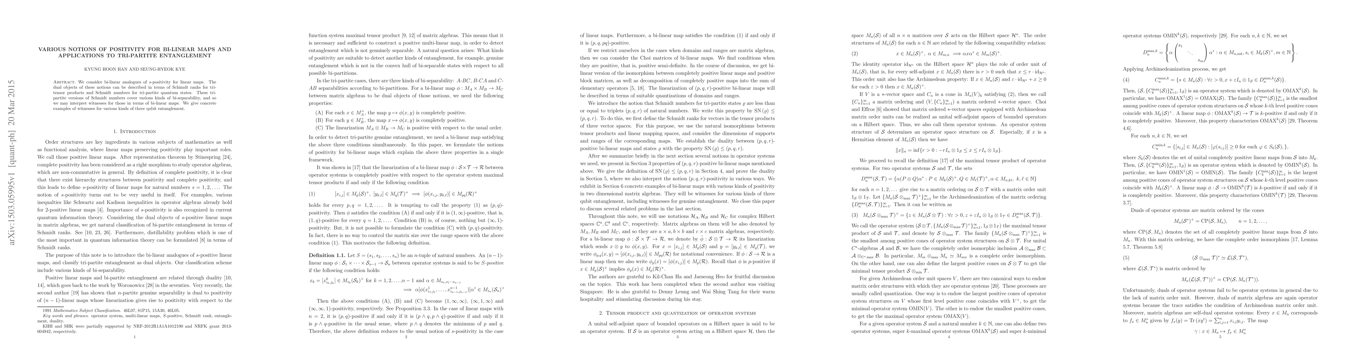 This paper explores bi-linear extensions of $s$-positivity for linear maps, linking these to Schmidt ranks in tri-tensor products and Schmidt numbers for tri-partite quantum states. It provides concrete examples of entanglement witnesses for different types of three qubit entanglement using bi-linear maps.