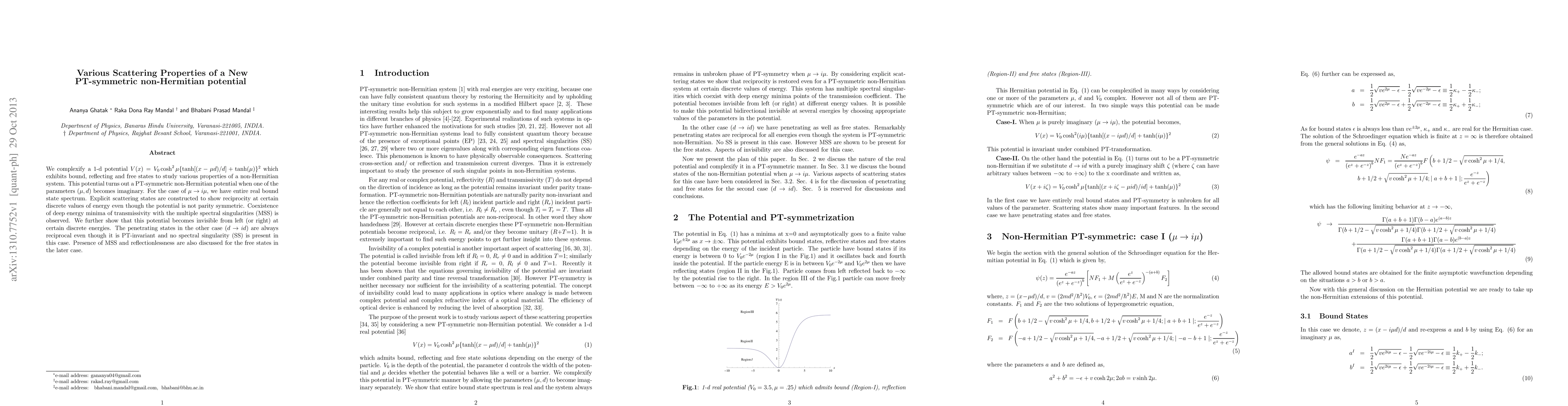 We complexify a 1-d potential which exhibits bound, reflecting and free states to study various properties of a non-Hermitian system. This potential turns out a PT-symmetric non-Hermitian potential when one of the parameters becomes imaginary. For one PT-symmetric case we have entire real bound state spectrum. Explicit scattering states are constructed to show reciprocity at certain discrete values of energy even though the potential is not parity symmetric. Coexistence of deep energy minima of transmissivity with the multiple spectral singularities (MSS) is observed. We further show that this potential becomes invisible from left (or right) at certain discrete energies. The penetrating states in the other PT-symmetric configuration are always reciprocal even though it is PT-invariant and no spectral singularity (SS) is present in this case. Presence of MSS and reflectionlessness are also discussed for the free states in the later case.