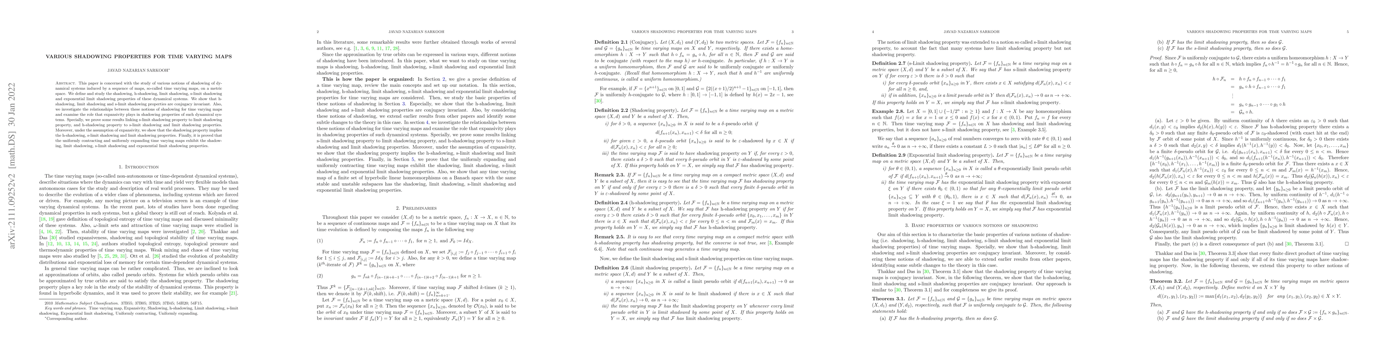 This paper explores various shadowing properties of time varying maps in dynamical systems, defining and analyzing h-shadowing, limit shadowing, s-limit shadowing, and exponential limit shadowing. It establishes conjugacy invariance for certain shadowing properties and investigates their interrelations, particularly under expansivity.