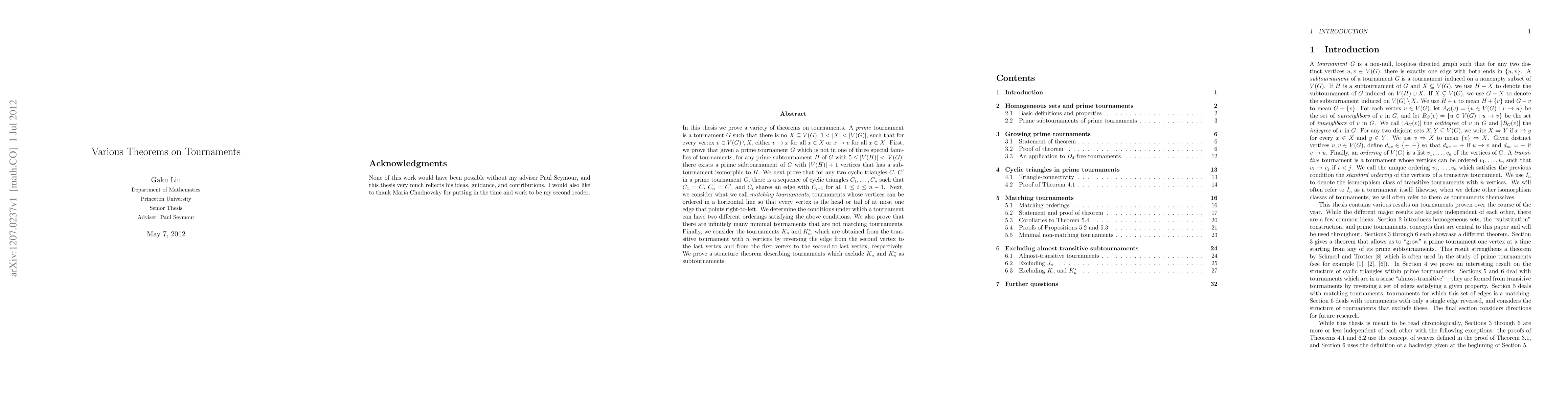 In this thesis we prove a variety of theorems on tournaments. A \emph{prime} tournament is a tournament $G$ such that there is no $X \subseteq V(G)$, $1 < |X| < |V(G)|$, such that for every vertex $v \in V(G) \minus X$, either $v \ra x$ for all $x \in X$ or $x \ra v$ for all $x \in X$. First, we prove that given a prime tournament $G$ which is not in one of three special families of tournaments, for any prime subtournament $H$ of $G$ with $5 \le |V(H)| < |V(G)|$ there exists a prime subtournament of $G$ with $|V(H)| + 1$ vertices that has a subtournament isomorphic to $H$. We next prove that for any two cyclic triangles $C$, $C^\prime$ in a prime tournament $G$, there is a sequence of cyclic triangles $C_1,...,C_n$ such that $C_1 = C$, $C_n = C^\prime$, and $C_i$ shares an edge with $C_{i+1}$ for all $1 \le i \le n-1$. Next, we consider what we call \emph{matching tournaments}, tournaments whose vertices can be ordered in a horizontal line so that every vertex is the head or tail of at most one edge that points right-to-left. We determine the conditions under which a tournament can have two different orderings satisfying the above conditions. We also prove that there are infinitely many minimal tournaments that are not matching tournaments. Finally, we consider the tournaments $K_n$ and $K_n^\ast$, which are obtained from the transitive tournament with $n$ vertices by reversing the edge from the second vertex to the last vertex and from the first vertex to the second-to-last vertex, respectively. We prove a structure theorem describing tournaments which exclude $K_n$ and $K_n^\ast$ as subtournaments.