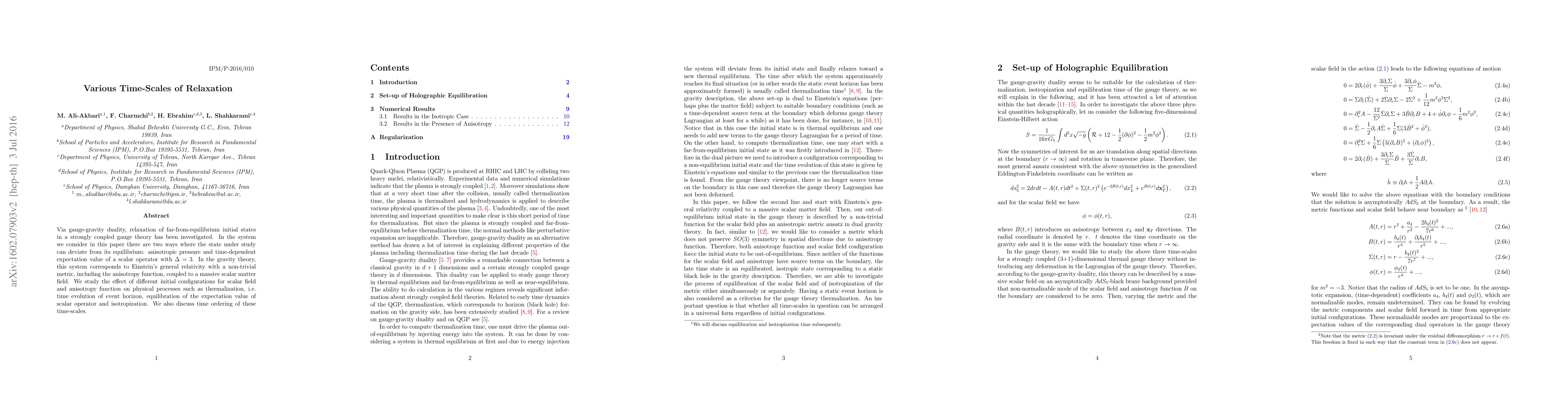 Via gauge-gravity duality, relaxation of far-from-equilibrium initial states in a strongly coupled gauge theory has been investigated. In the system we consider in this paper there are two ways where the state under study can deviate from its equilibrium: anisotropic pressure and time-dependent expectation value of a scalar operator with \Delta=3. In the gravity theory, this system corresponds to Einstein's general relativity with a non-trivial metric, including the anisotropy function, coupled to a massive scalar matter field. We study the effect of different initial configurations for scalar field and anisotropy function on physical processes such as thermalization, i.e. time evolution of event horizon, equilibration of the expectation value of scalar operator and isotropization. We also discuss time ordering of these time-scales.