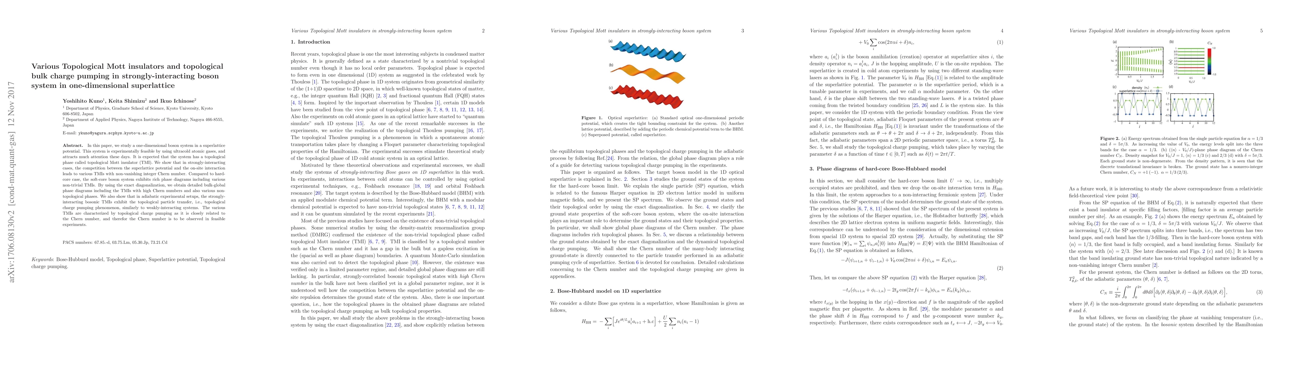 This paper investigates a one-dimensional boson system in a superlattice, focusing on topological Mott insulators (TMIs) under strong interactions. It reveals diverse TMIs with non-vanishing integer Chern numbers, especially in soft-core systems, and demonstrates topological charge pumping phenomena observable in experiments.
