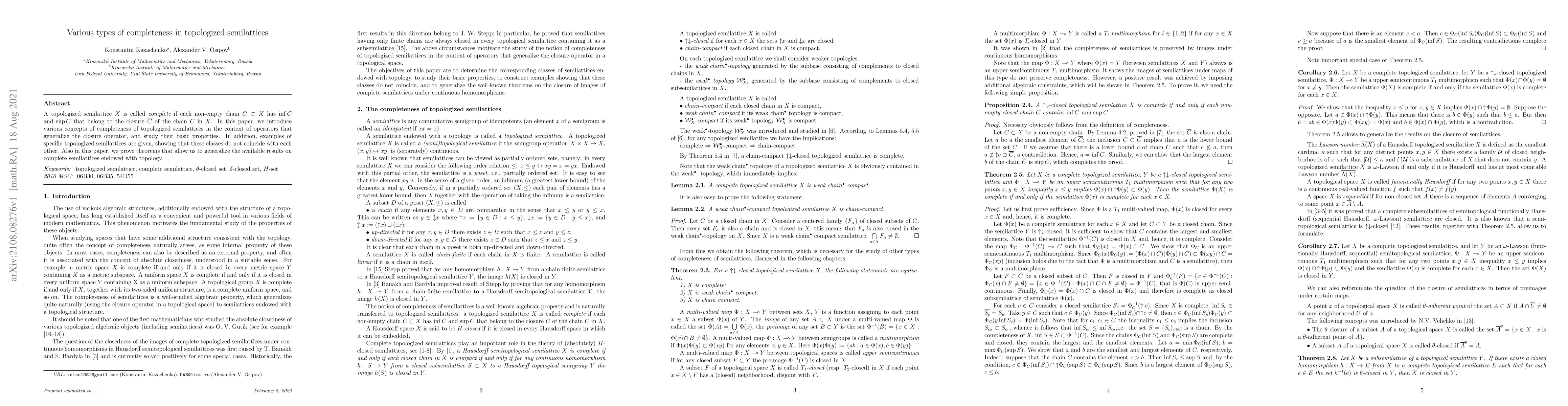 A topologized semilattice $X$ is called complete if each non-empty chain $C\subset X$ has $\inf C$ and $\sup C$ that belong to the closure $C$ of the chain $C$ in $X$. In this paper, we introduce various concepts of completeness of topologized semilattices in the context of operators that generalize the closure operator, and study their basic properties. In addition, examples of specific topologized semilattices are given, showing that these classes do not coincide with each other. Also in this paper, we prove theorems that allow us to generalize the available results on complete semilattices endowed with topology.