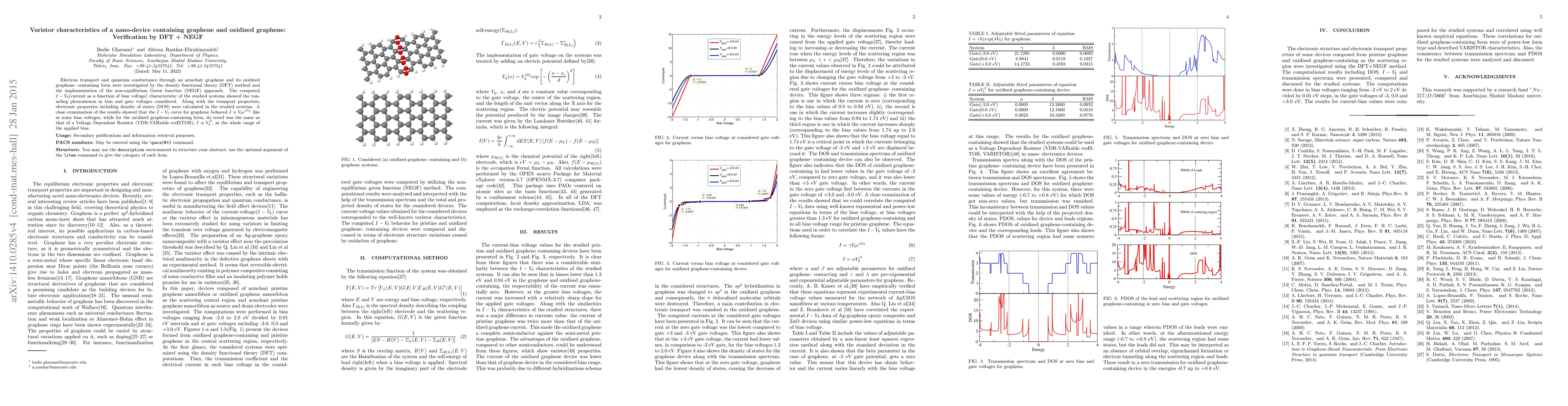 Electron transport and quantum conductance through an armchair graphene and its oxidized graphene- containing form were investigated by the density functional theory (DFT) method and the implementation of the non-equilibrium Green function (NEGF) approach. The computed $I-V_b$(current as a function of bias voltage) characteristic of the studied systems showed the tunneling phenomenon in bias and gate voltages considered. Along with the transport properties, electronic properties including density of states (DOS) were calculated in the studied systems. A close examination of the results showed that the $I-V_b$ curve for graphene behaved $I\propto V_be^{\lambda V_b}$ like at some bias voltages, while for the oxidized graphene-containing form, its trend was the same as that of a Voltage Dependent Resistor (VDR-VARiable resISTOR), $I\propto V_b^\beta$, at the whole range of the applied bias.