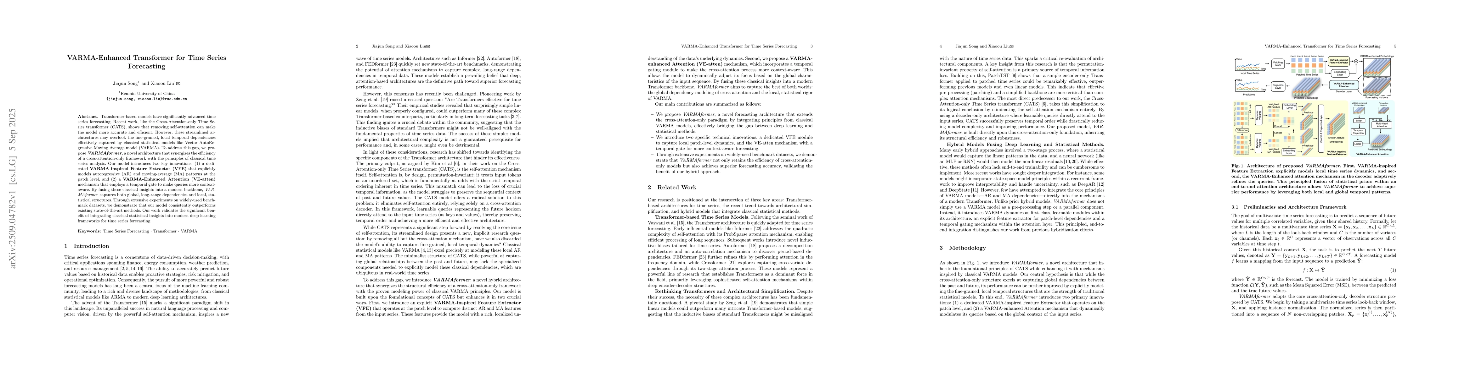 Transformer-based models have significantly advanced time series forecasting. Recent work, like the Cross-Attention-only Time Series transformer (CATS), shows that removing self-attention can make the model more accurate and efficient. However, these streamlined architectures may overlook the fine-grained, local temporal dependencies effectively captured by classical statistical models like Vector AutoRegressive Moving Average model (VARMA). To address this gap, we propose VARMAformer, a novel architecture that synergizes the efficiency of a cross-attention-only framework with the principles of classical time series analysis. Our model introduces two key innovations: (1) a dedicated VARMA-inspired Feature Extractor (VFE) that explicitly models autoregressive (AR) and moving-average (MA) patterns at the patch level, and (2) a VARMA-Enhanced Attention (VE-atten) mechanism that employs a temporal gate to make queries more context-aware. By fusing these classical insights into a modern backbone, VARMAformer captures both global, long-range dependencies and local, statistical structures. Through extensive experiments on widely-used benchmark datasets, we demonstrate that our model consistently outperforms existing state-of-the-art methods. Our work validates the significant benefit of integrating classical statistical insights into modern deep learning frameworks for time series forecasting.