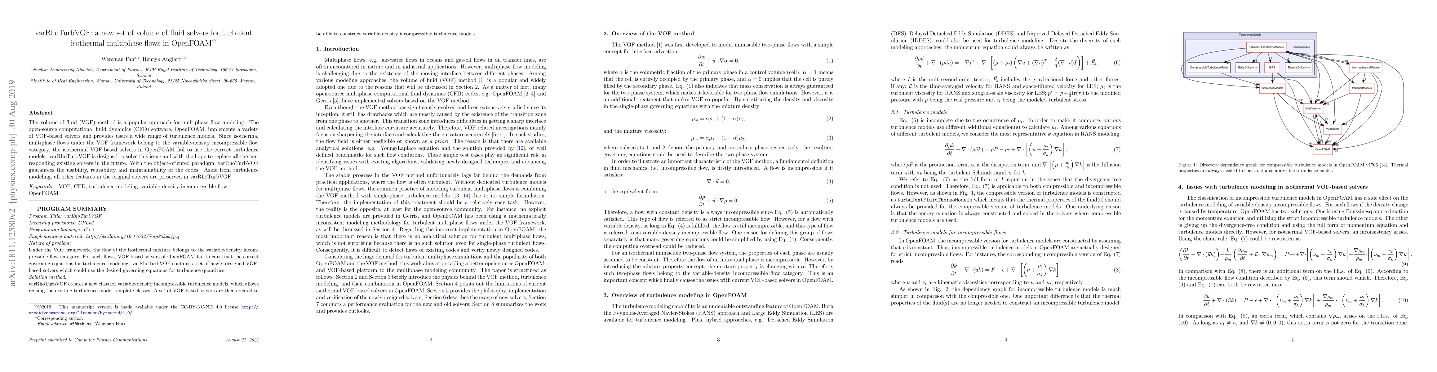 varRhoTurbVOF is a new set of volume of fluid solvers for turbulent isothermal multiphase flows in OpenFOAM, designed to correct the turbulence modeling issues in existing solvers while preserving all other features. It aims to replace current solvers with its improved turbulence modeling and object-oriented code structure.