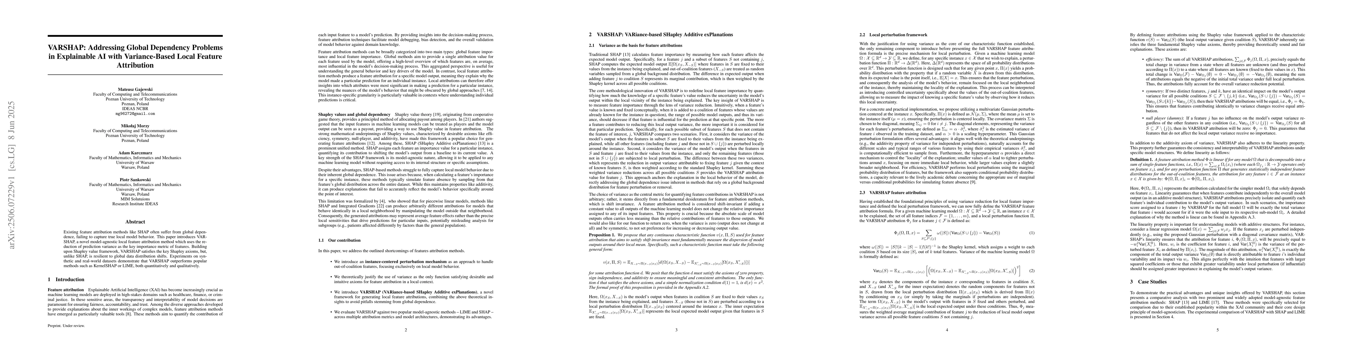 VARSHAP is a new model-agnostic method for feature attribution in Explainable AI that uses variance-based local feature importance to avoid global dependencies, outperforming existing methods like SHAP and KernelSHAP.