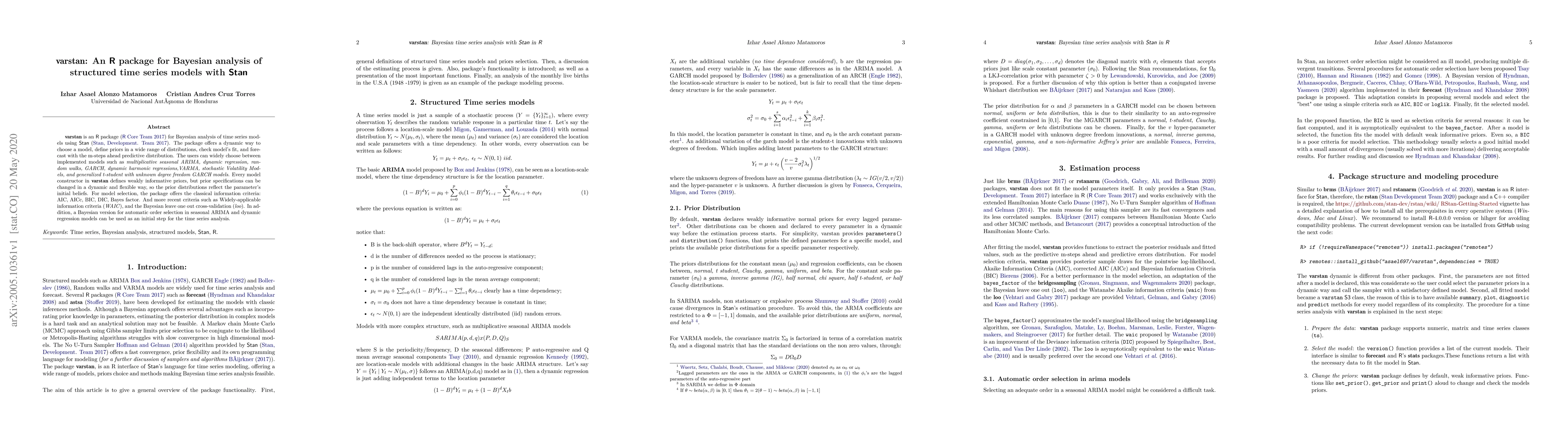 varstan is an R package that facilitates Bayesian analysis of structured time series models using Stan, offering dynamic model selection, flexible prior specification, and advanced model fit assessment tools, including WAIC and loo for model selection.