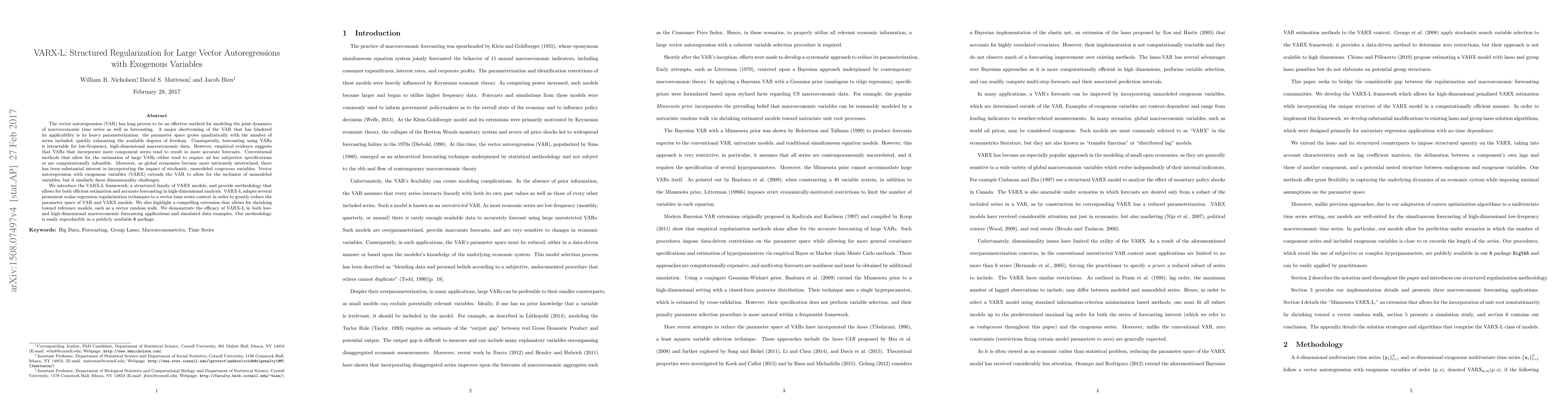 The paper introduces VARX-L, a structured regularization approach for large vector autoregressions with exogenous variables, addressing the high dimensionality issue. It combines scalar regression regularization techniques with VARX models to efficiently estimate and forecast in high-dimensional macroeconomic data, demonstrating its effectiveness through empirical applications and a publicly available R package.