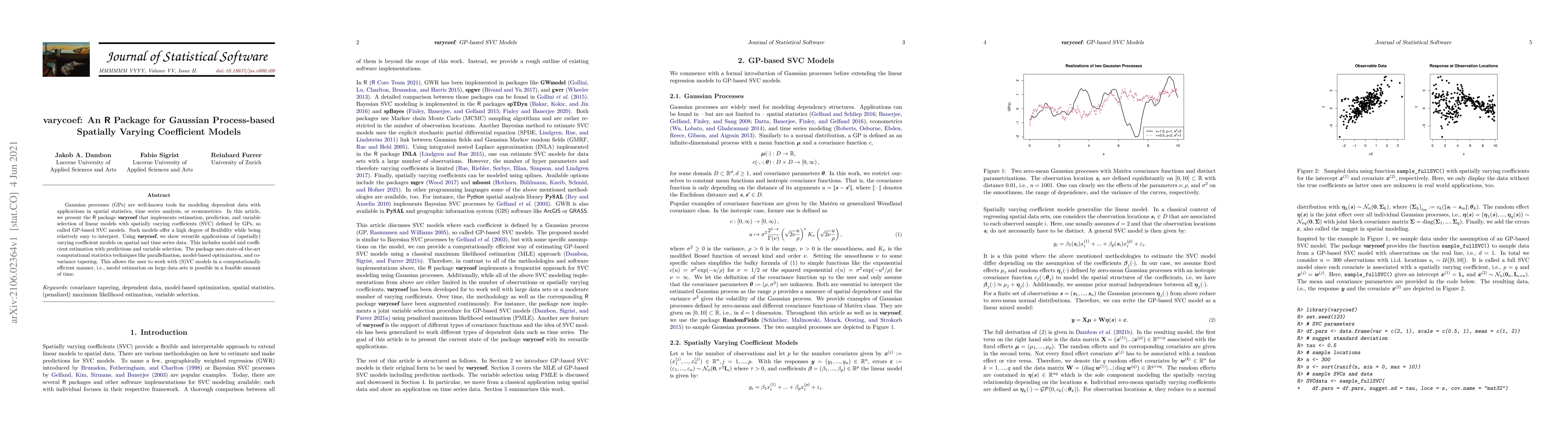 The R package varycoef implements Gaussian process-based spatially varying coefficient models for flexible and interpretable linear models, offering efficient computation through parallelization and optimization techniques. The package facilitates estimation, prediction, and variable selection for spatially varying coefficient models on spatial and time series data.