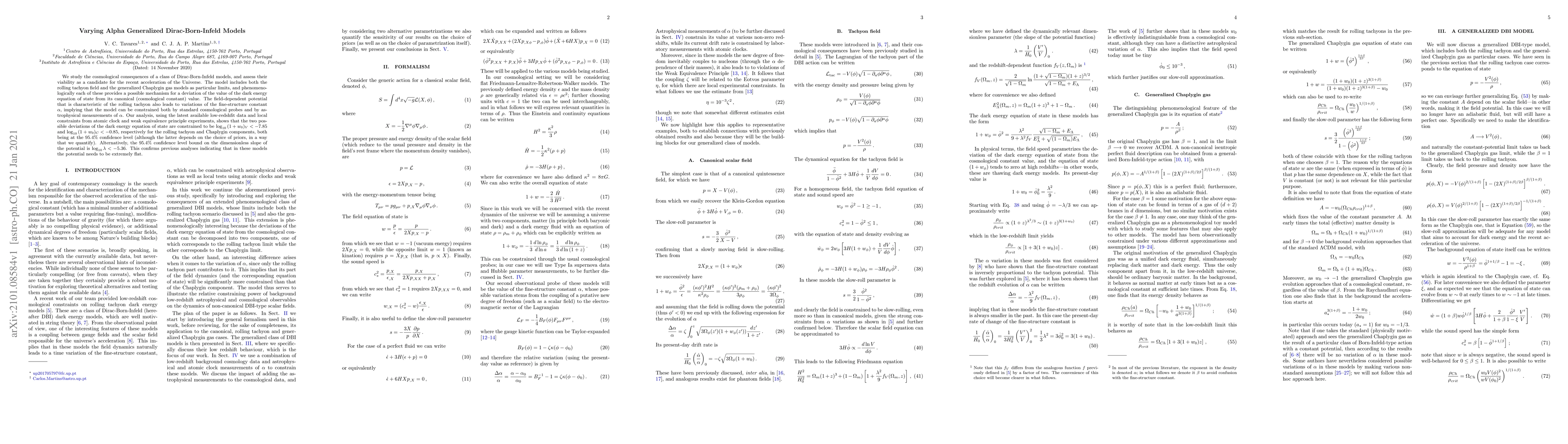 We study the cosmological consequences of a class of Dirac-Born-Infeld models, and assess their viability as a candidate for the recent acceleration of the Universe. The model includes both the rolling tachyon field and the generalized Chaplygin gas models as particular limits, and phenomenologically each of these provides a possible mechanism for a deviation of the value of the dark energy equation of state from its canonical (cosmological constant) value. The field-dependent potential that is characteristic of the rolling tachyon also leads to variations of the fine-structure constant $\alpha$, implying that the model can be constrained both by standard cosmological probes and by astrophysical measurements of $\alpha$. Our analysis, using the latest available low-redshfit data and local constraints from atomic clock and weak equivalence principle experiments, shows that the two possible deviations of the dark energy equation of state are constrained to be $\log_{10}{(1+w_0)_V}<-7.85$ and $\log_{10}{(1+w_0)_C}<-0.85$, respectively for the rolling tachyon and Chaplygin components, both being at the $95.4\%$ confidence level (although the latter depends on the choice of priors, in a way that we quantify). Alternatively, the $95.4\%$ confidence level bound on the dimensionless slope of the potential is $\log_{10}{\lambda}<-5.36$. This confirms previous analyses indicating that in these models the potential needs to be extremely flat.