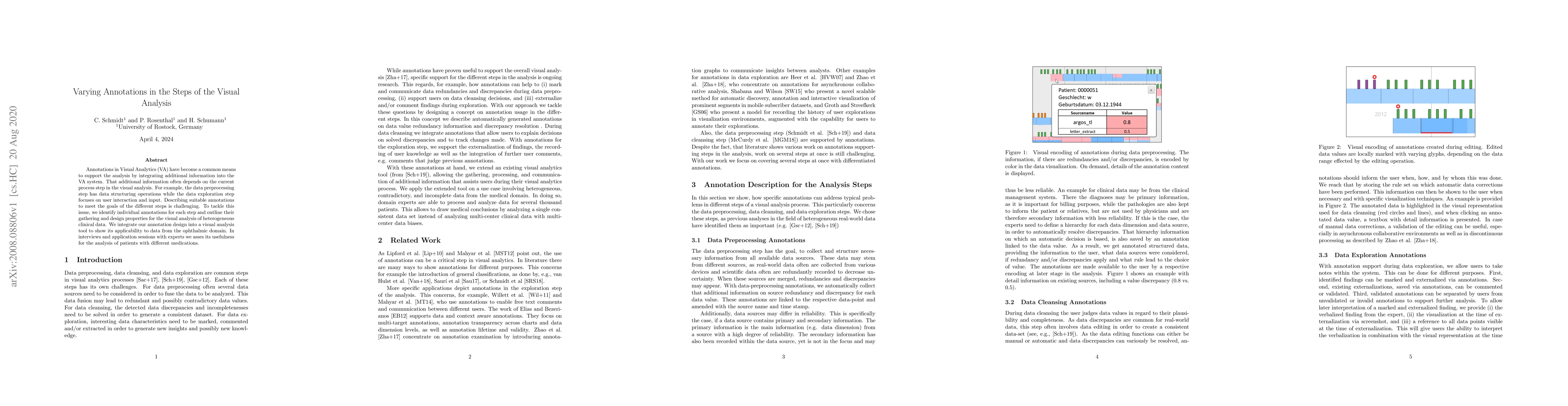 Annotations in Visual Analytics (VA) have become a common means to support the analysis by integrating additional information into the VA system. That additional information often depends on the current process step in the visual analysis. For example, the data preprocessing step has data structuring operations while the data exploration step focuses on user interaction and input. Describing suitable annotations to meet the goals of the different steps is challenging. To tackle this issue, we identify individual annotations for each step and outline their gathering and design properties for the visual analysis of heterogeneous clinical data. We integrate our annotation design into a visual analysis tool to show its applicability to data from the ophthalmic domain. In interviews and application sessions with experts we asses its usefulness for the analysis of patients with different medications.