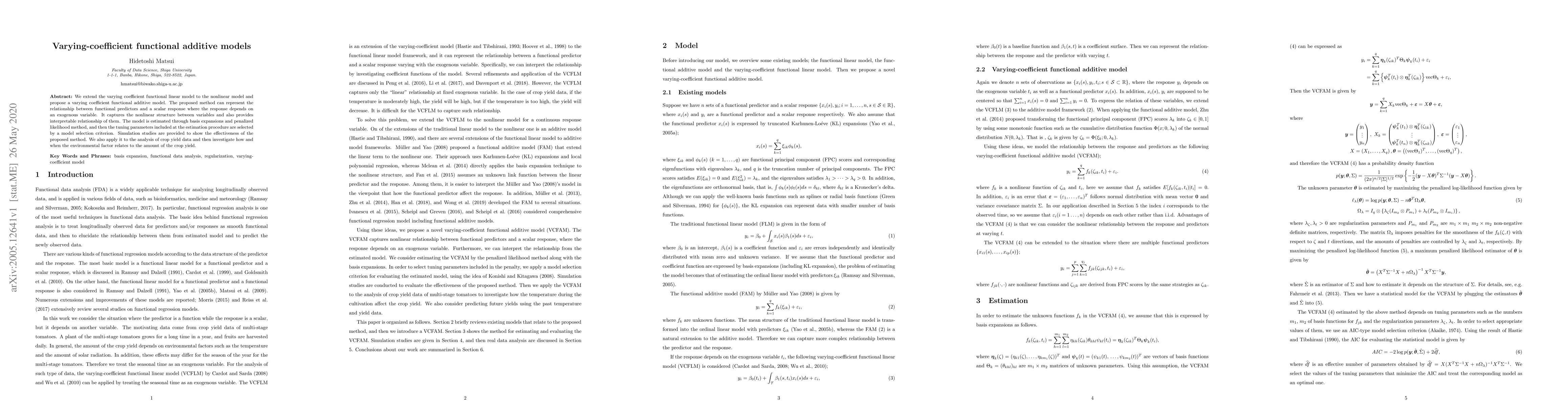 This paper proposes a varying coefficient functional additive model to represent nonlinear relationships between functional predictors and a scalar response, employing basis expansions and penalized likelihood for estimation. The model is validated through simulations and applied to analyze crop yield data, demonstrating its effectiveness in capturing environmental influences on yield.