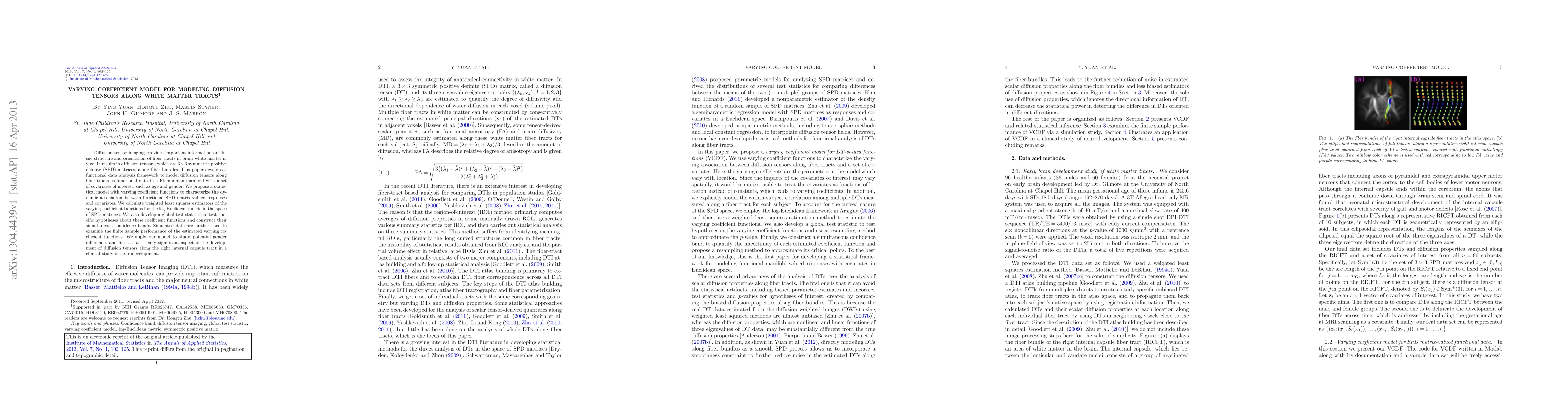 This paper proposes a varying coefficient model for analyzing diffusion tensors along brain white matter tracts using functional data analysis on Riemannian manifolds. The model estimates the dynamic association between diffusion tensors and covariates like age and gender, revealing significant gender differences in diffusion tensor development along the right internal capsule tract.