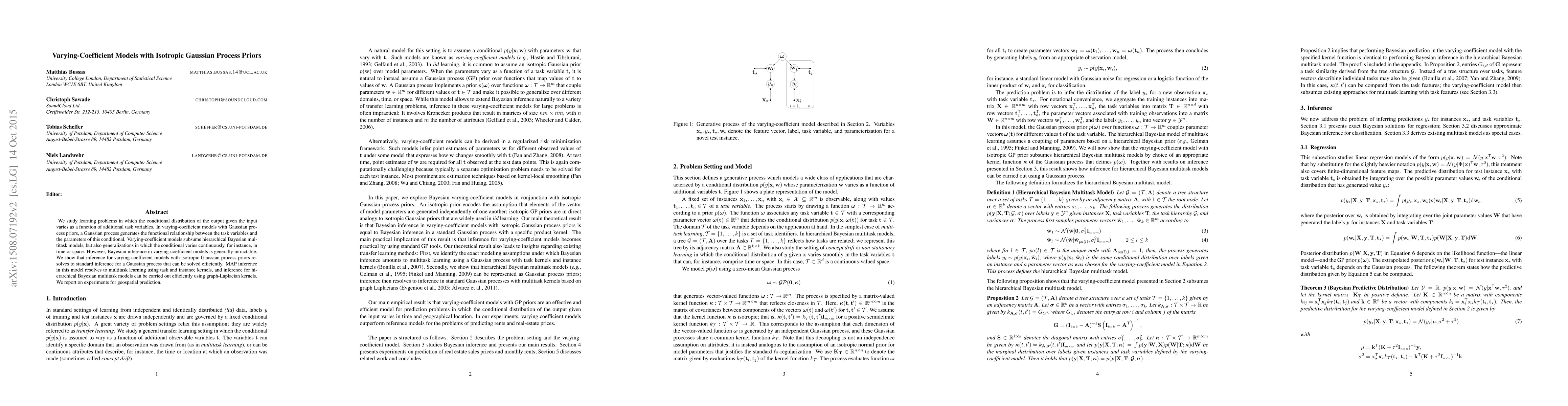 This paper proposes varying-coefficient models with isotropic Gaussian process priors to handle conditional distributions that vary with additional task variables. It demonstrates efficient inference methods for these models, enabling scalable multitask learning and geospatial prediction.
