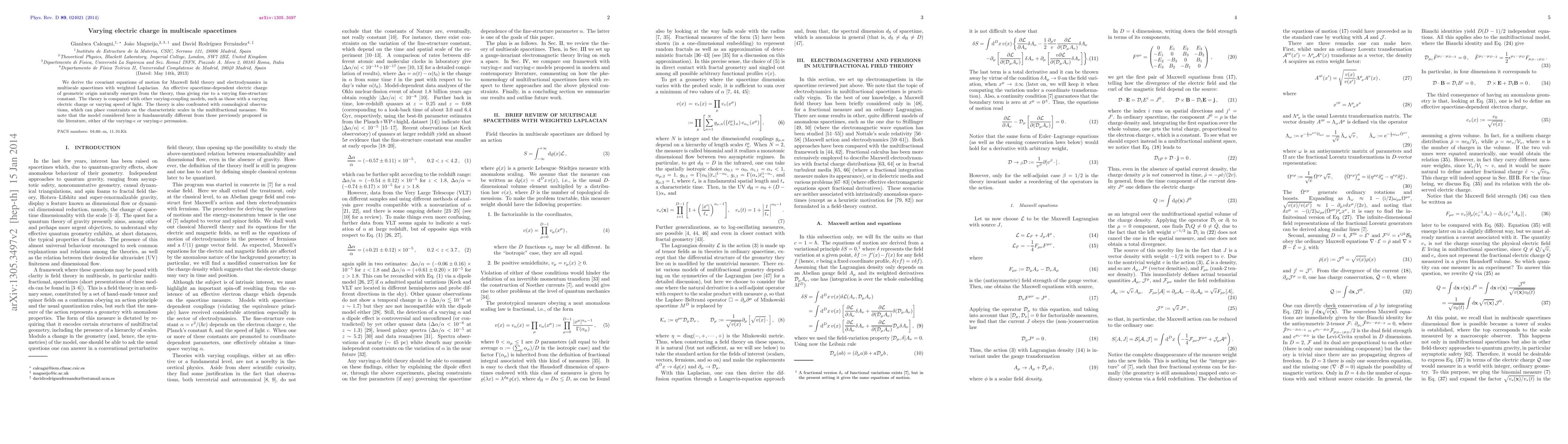 We derive the covariant equations of motion for Maxwell field theory and electrodynamics in multiscale spacetimes with weighted Laplacian. An effective spacetime-dependent electric charge of geometric origin naturally emerges from the theory, thus giving rise to a varying fine-structure constant. The theory is compared with other varying-coupling models, such as those with a varying electric charge or varying speed of light. The theory is also confronted with cosmological observations, which can place constraints on the characteristic scales in the multifractional measure. We note that the model considered here is fundamentally different from those previously proposed in the literature, either of the varying-e or varying-c persuasion.