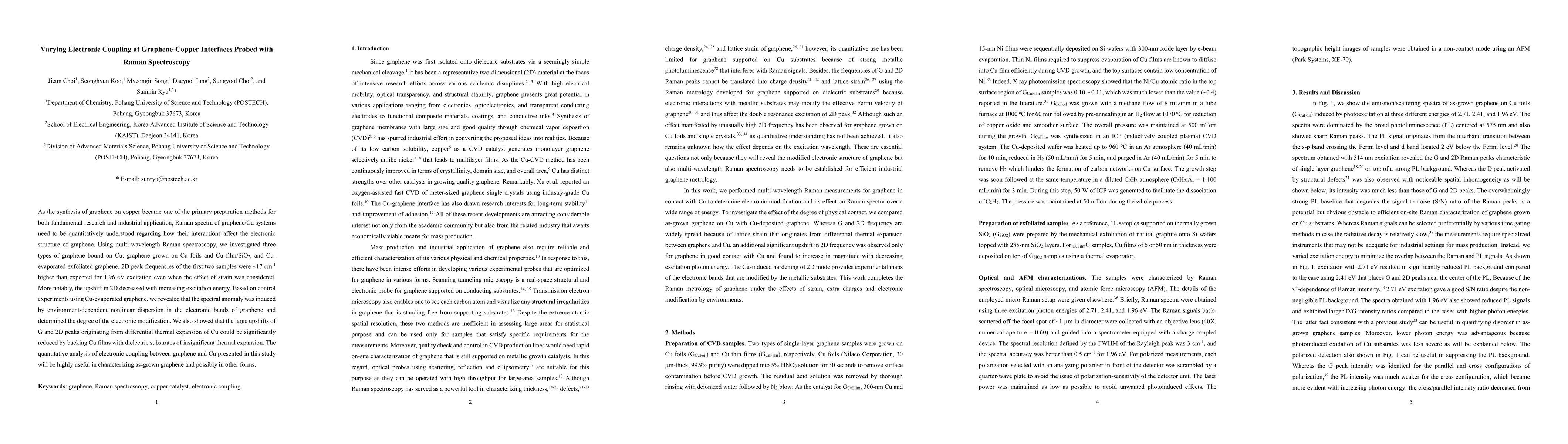This study utilizes multi-wavelength Raman spectroscopy to analyze electronic coupling at graphene-copper interfaces, finding that the 2D peak frequency shifts are influenced by nonlinear dispersion effects. The upshift in 2D peaks decreases with higher excitation energy, revealing environment-dependent electronic modifications in graphene on Cu substrates.
