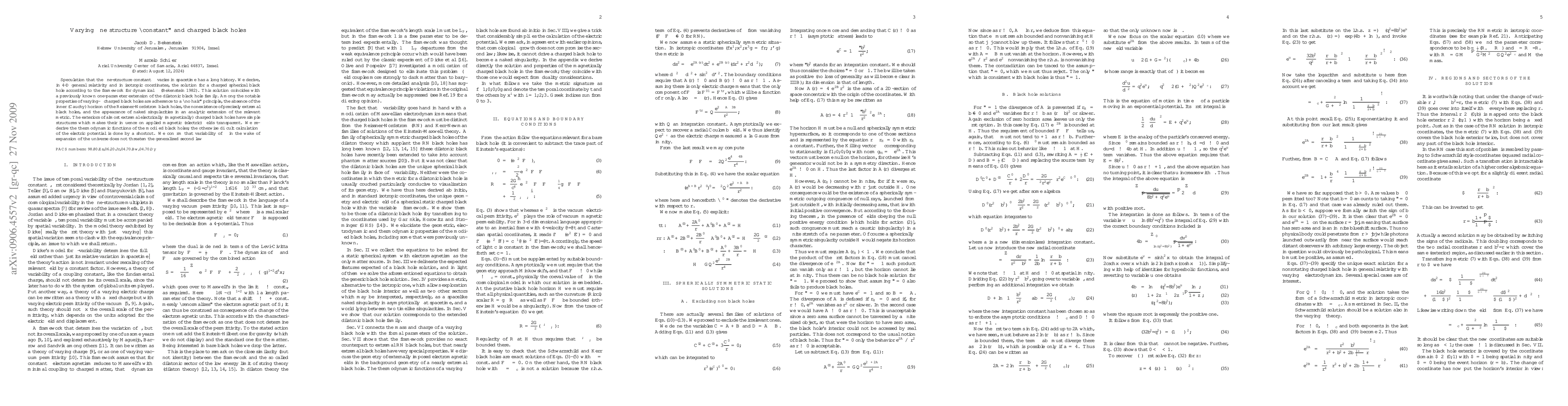 Speculation that the fine-structure constant $\alpha$ varies in spacetime has a long history. We derive, in 4-D general relativity and in isotropic coordinates, the solution for a charged spherical black hole according to the framework for dynamical $\alpha$ (Bekenstein 1982). This solution coincides with a previously known one-parameter extension of the dilatonic black hole family. Among the notable properties of varying-$\alpha$ charged black holes are adherence to a ``no hair'' principle, the absence of the inner (Cauchy) horizon of the Reissner-Nordstrom black holes, the nonexistence of precisely extremal black holes, and the appearance of naked singularities in an analytic extension of the relevant metric. The exteriors of almost extremal electrically (magnetically) charged black holes have simple structures which makes their influence on applied magnetic (electric) fields transparent. We re-derive the thermodynamic functions of the modified black holes; the otherwise difficult calculation of the electric potential is done by a shortcut. We confirm that variability of $\alpha$ in the wake of expansion of the universe does not threaten the generalized second law