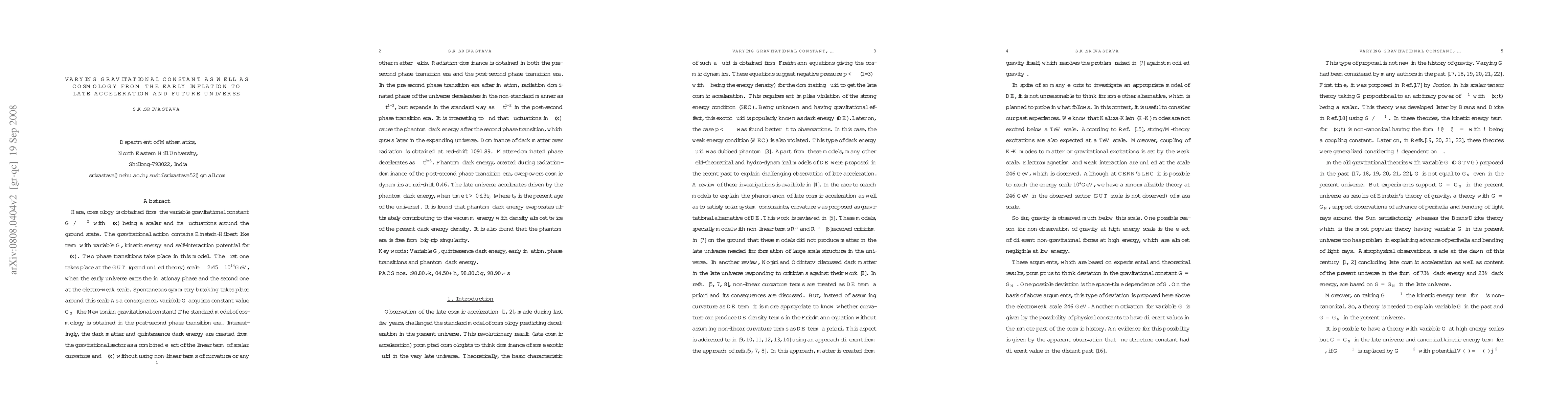Here, cosmology is obtained from the variable gravitational constant $ G \propto \phi^{-2}$ with $ \phi(x) $ being a scalar and its fluctuations around the ground state. The gravitational action contains Einstein-Hilbert like term with variable $ G $, kinetic energy and self-interaction potential for $ \phi(x) $. Two phase transitions take place in this model. The first one takes place at the GUT (grand unified theory) scale $ \sim 2.45 \times 10^{14}{\rm GeV} $, when the early universe exits the inflationay phase and the second one at the electro-weak scale. Spontaneous symmetry breaking takes place around this scale As a consequence, variable $ G $ acquires constant value $G_N$ (the Newtonian gravitational constant).The standard model of cosmology is obtained in the post-second phase transition era. Interestingly, the dark matter and quintessence dark energy are created from the gravitational sector as a combined effect of the linear term of scalar curvature and $ \phi(x) $ without using non-linear terms of curvature or any other matter fields. It is interesting to find that fluctuations in $ \phi(x) $ cause the phantom dark energy after the second phase transition, which grows later in the expanding universe. It is also found that the phantom era is free from big-rip singularity.