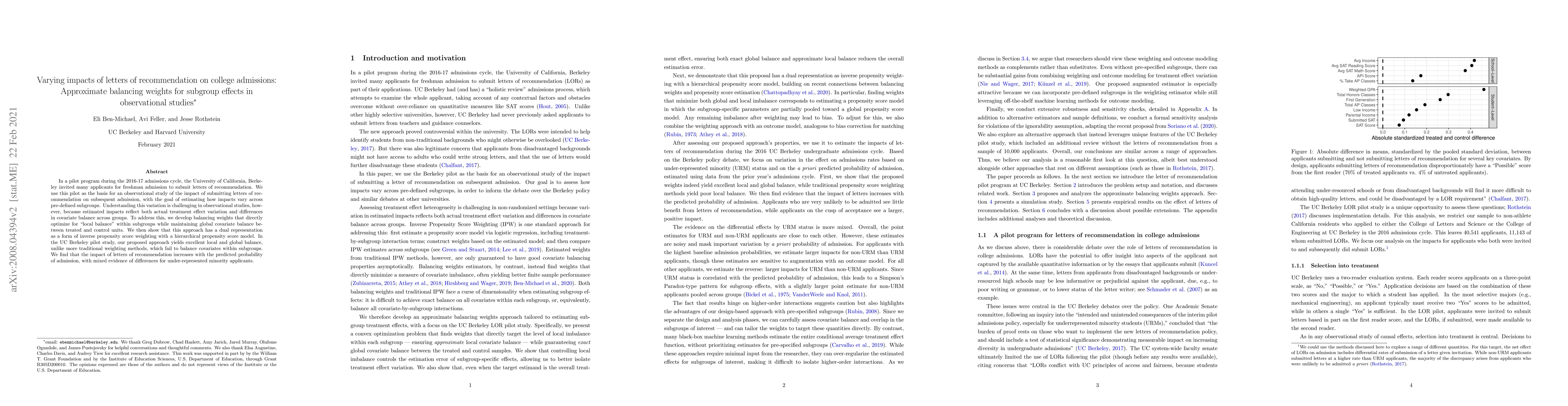This study examines the varying effects of letters of recommendation on college admissions at UC Berkeley, developing balancing weights to optimize local balance within subgroups while maintaining global balance. The results show improved balance and suggest that recommendation letters have a greater impact on admissions for higher-probability applicants, with mixed evidence regarding under-represented minorities.