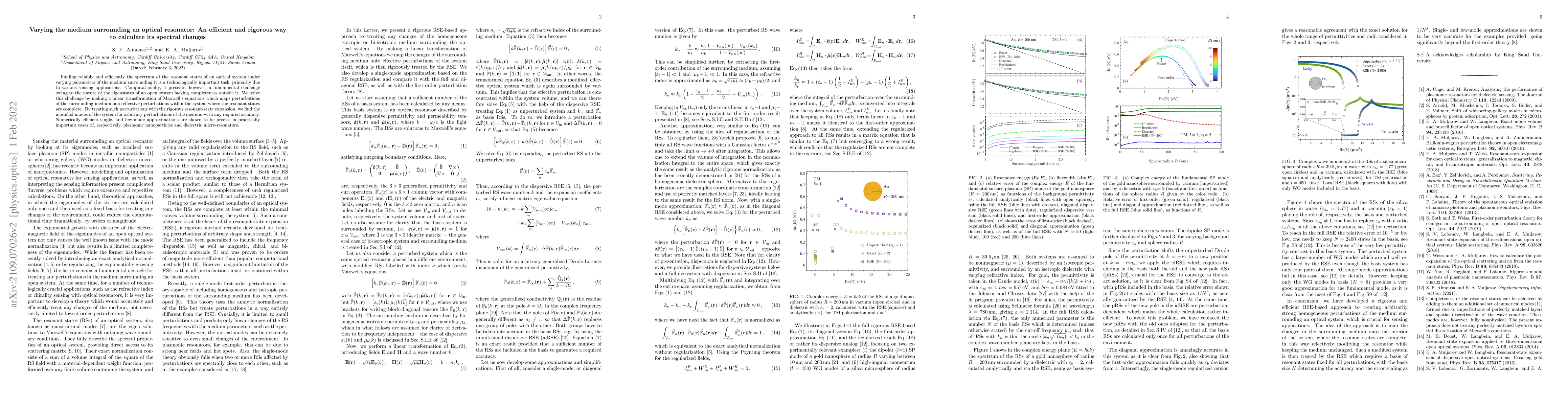Finding reliably and efficiently the spectrum of the resonant states of an optical system under varying parameters of the medium surrounding it is a technologically important task, primarily due to various sensing applications. Computationally, it presents, however, a fundamental challenge owing to the nature of the eigenstates of an open system lacking completeness outside it. We solve this challenge by making a linear transformation of Maxwell's equations which maps perturbations of the surrounding medium onto effective perturbations within the system where the resonant states are complete. By treating such perturbations with the rigorous resonant state expansion, we find the modified modes of the system for arbitrary perturbations of the medium with any required accuracy. Numerically efficient single and few mode approximations are shown to be precise in practically important cases of, respectively, plasmonic nanoparticles and dielectric micro resonators.