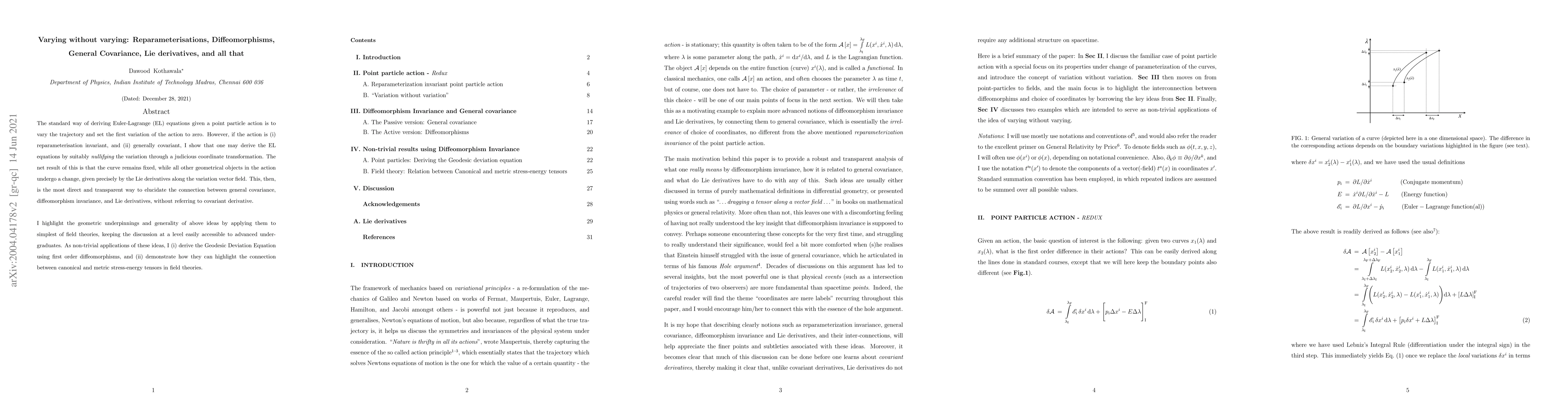 The standard way of deriving Euler-Lagrange (EL) equations given a point particle action is to vary the trajectory and set the first variation of the action to zero. However, if the action is (i) reparameterisation invariant, and (ii) generally covariant, I show that one may derive the EL equations by suitably "nullifying" the variation through a judicious coordinate transformation. The net result of this is that the curve remains fixed, while all other geometrical objects in the action undergo a change, given precisely by the Lie derivatives along the variation vector field. This, then, is the most direct and transparent way to elucidate the connection between general covariance, diffeomorphism invariance, and Lie derivatives, without referring to covariant derivative. I highlight the geometric underpinnings and generality of above ideas by applying them to simplest of field theories, keeping the discussion at a level easily accessible to advanced undergraduates. As non-trivial applications of these ideas, I (i) derive the Geodesic Deviation Equation using first order diffeomorphisms, and (ii) demonstrate how they can highlight the connection between canonical and metric stress-energy tensors in field theories.
