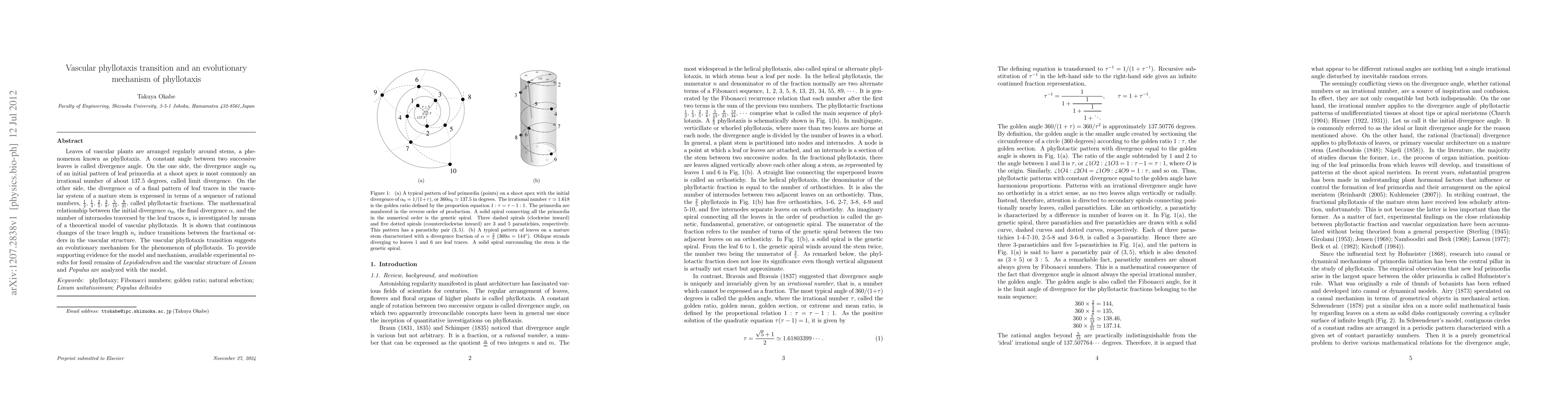 Leaves of vascular plants are arranged regularly around stems, a phenomenon known as phyllotaxis. A constant angle between two successive leaves is called divergence angle. On the one side, the divergence angle $\alpha_0$ of an initial pattern of leaf primordia at a shoot apex is most commonly an irrational number of about 137.5 degrees, called limit divergence. On the other side, the divergence $\alpha$ of a final pattern of leaf traces in the vascular system of a mature stem is expressed in terms of a sequence of rational numbers, 1/2, 1/3, 2/5, 3/8, 5/13, 8/21, called phyllotactic fractions. The mathematical relationship between the initial divergence $\alpha_0$, the final divergence $\alpha$, and the number of internodes traversed by the leaf traces $n_c$ is investigated by means of a theoretical model of vascular phyllotaxis. It is shown that continuous changes of the trace length $n_c$ induce transitions between the fractional orders in the vascular structure. The vascular phyllotaxis transition suggests an evolutionary mechanism for the phenomenon of phyllotaxis. To provide supporting evidence for the model and mechanism, available experimental results for fossil remains of Lepidodendron and the vascular structure of Linum and Populus are analyzed with the model.