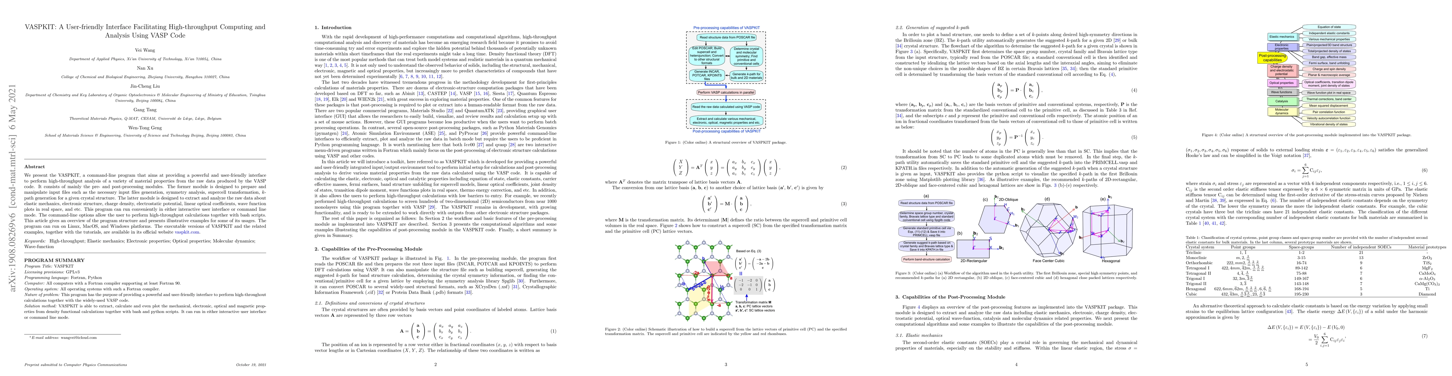 VASPKIT is a user-friendly command-line program designed to facilitate high-throughput analysis of material properties from VASP code outputs, featuring pre- and post-processing modules for data manipulation and extraction. It supports Linux, MacOS, and Windows, and is available with tutorials and examples on its official website.