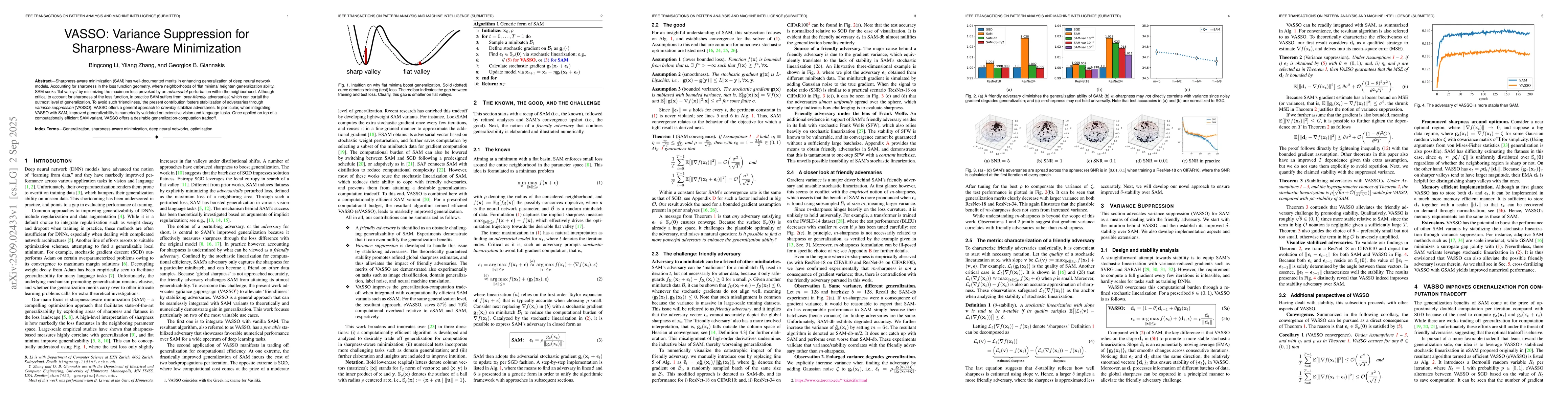 Sharpness-aware minimization (SAM) has well-documented merits in enhancing generalization of deep neural network models. Accounting for sharpness in the loss function geometry, where neighborhoods of `flat minima' heighten generalization ability, SAM seeks `flat valleys' by minimizing the maximum loss provoked by an adversarial perturbation within the neighborhood. Although critical to account for sharpness of the loss function, in practice SAM suffers from `over-friendly adversaries,' which can curtail the outmost level of generalization. To avoid such `friendliness,' the present contribution fosters stabilization of adversaries through variance suppression (VASSO). VASSO offers a general approach to provably stabilize adversaries. In particular, when integrating VASSO with SAM, improved generalizability is numerically validated on extensive vision and language tasks. Once applied on top of a computationally efficient SAM variant, VASSO offers a desirable generalization-computation tradeoff.