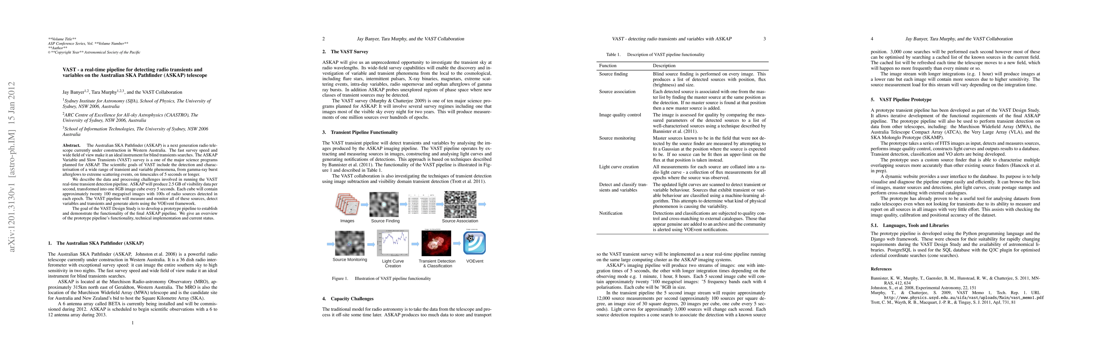 The VAST survey on the ASKAP telescope aims to detect and characterize radio transients and variables using real-time data processing. The VAST pipeline handles 2.5 GB of data per second, generating alerts for variable and transient phenomena, and a prototype has been developed to demonstrate its functionality.