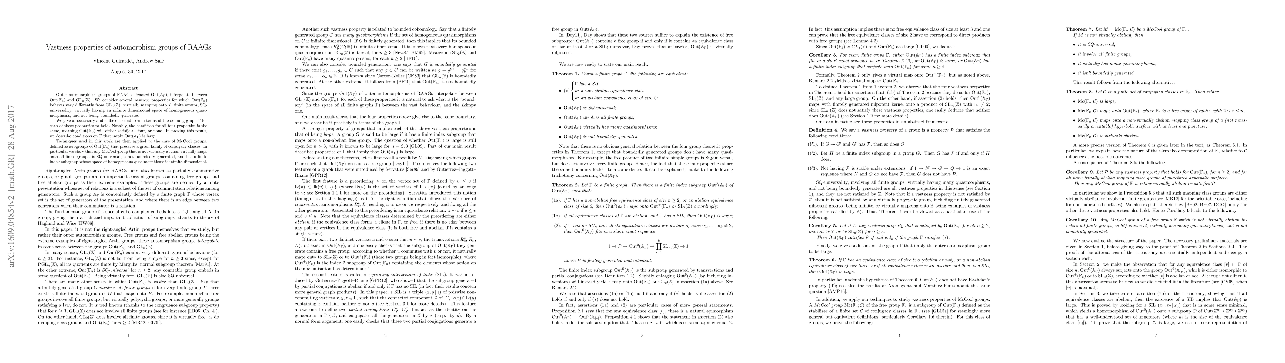 Outer automorphism groups of RAAGs, denoted $Out(A_\Gamma)$, interpolate between $Out(F_n)$ and $GL_n(\mathbb{Z})$. We consider several vastness properties for which $Out(F_n)$ behaves very differently from $GL_n(\mathbb{Z})$: virtually mapping onto all finite groups, SQ-universality, virtually having an infinite dimensional space of homogeneous quasimorphisms, and not being boundedly generated. We give a neccessary and sufficient condition in terms of the defining graph $\Gamma$ for each of these properties to hold. Notably, the condition for all four properties is the same, meaning $Out(A_\Gamma)$ will either satisfy all four, or none. In proving this result, we describe conditions on $\Gamma$ that imply $Out(A_\Gamma)$ is large. Techniques used in this work are then applied to the case of McCool groups, defined as subgroups of $Out(F_n)$ that preserve a given family of conjugacy classes. In particular we show that any McCool group that is not virtually abelian virtually maps onto all finite groups, is SQ-universal, is not boundedly generated, and has a finite index subgroup whose space of homogeneous quasimorphisms is infinite dimensional.
