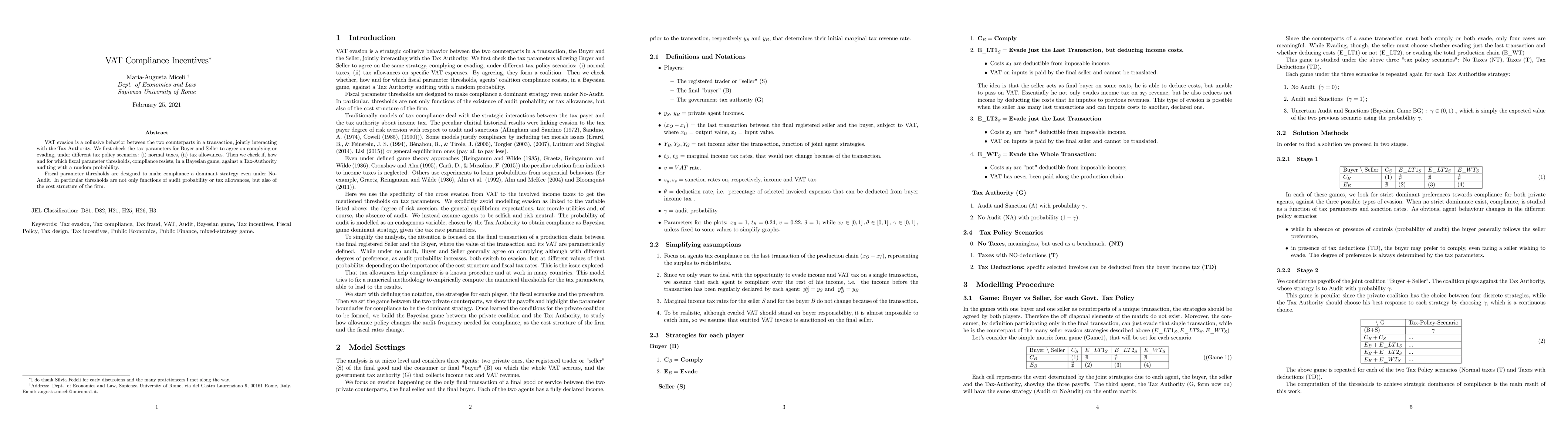 This paper uses game theory to analyze VAT evasion incentives, arguing that compliance is rational when it's less costly than evasion, even without controls. It proposes a framework to measure compliance incentives through VAT deduction policies, aiming to determine optimal parameters for different taxpayer classes.