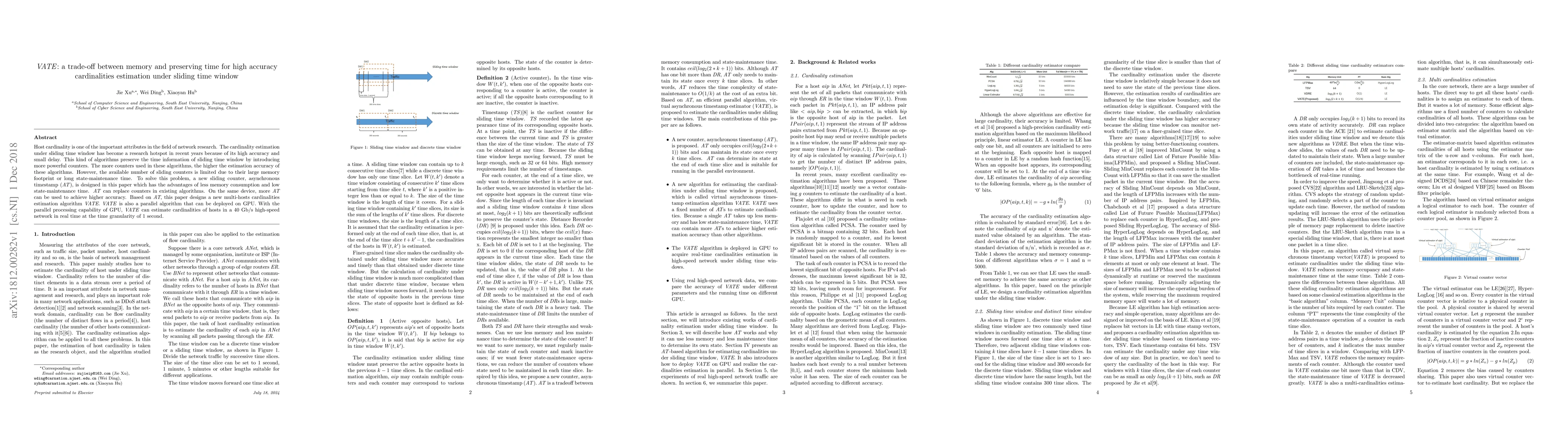 The paper introduces VATE, a new algorithm for high-accuracy host cardinality estimation under a sliding time window, balancing memory usage with time preservation. VATE employs asynchronous timestamps (AT) to reduce memory footprint and state-maintenance time, enabling real-time cardinality estimation in high-speed networks using GPU parallel processing.