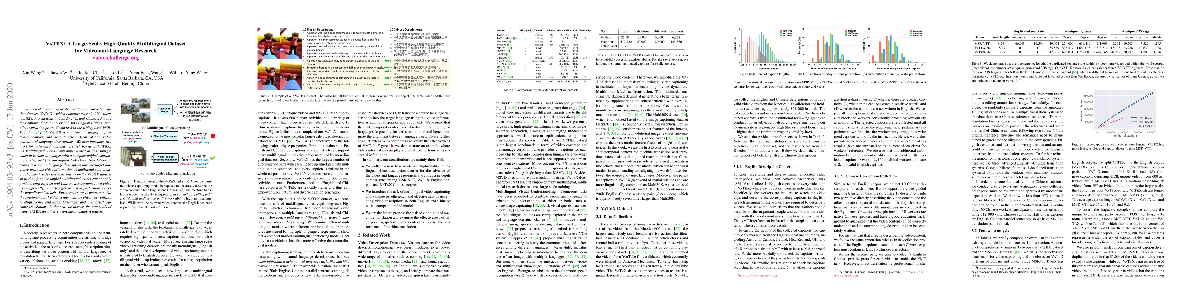 VATEX is a large-scale multilingual video description dataset featuring over 41,250 videos and 825,000 captions in English and Chinese, including 206,000 parallel translation pairs. It enables research in multilingual video captioning and video-guided machine translation, showing improved performance over monolingual models and effective use of video context for translation.