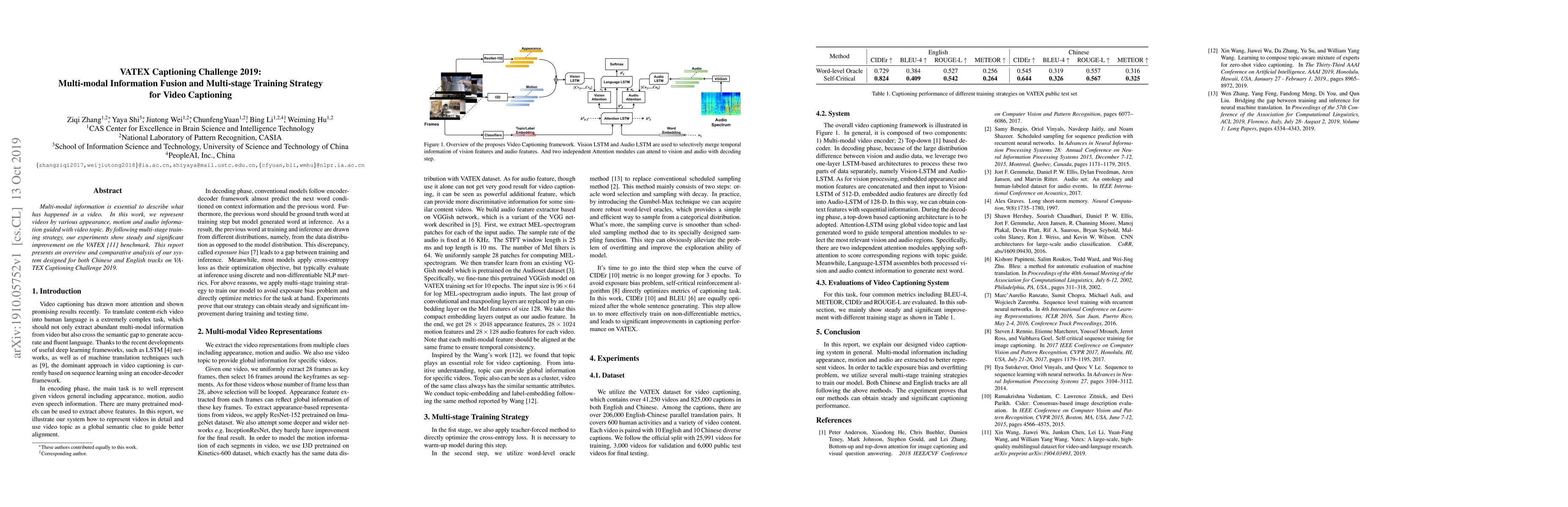 This paper presents a multi-modal information fusion and multi-stage training strategy for video captioning, achieving significant improvements on the VATEX benchmark. The system effectively combines appearance, motion, and audio information guided by video topics, and demonstrates superior performance on both Chinese and English tracks in the VATEX Captioning Challenge 2019.